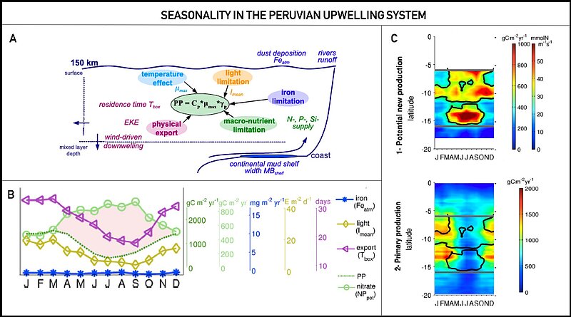 Abbildung 1: Saisonalität der Primärproduktion, Nitrat-, Eisen- und Lichtverfügbarkeit sowie des Verlusts durch Export (von Messie und Chavez 2015). A: Schema der wichtigsten Faktoren, die die Primärproduktion regulieren. B: saisonale Zyklen der Primärproduktion und ihrer regulierenden Faktoren. C1 und C2: Zeit-Breitengrad-Diagramme von Daten, die in einem 150 km langen Küstenstreifen in Längsrichtung gemittelt wurden. C1 stellt sowohl die Nitratversorgung (Farbbalken mmol N m-1 s-1) als auch die potentielle Neuproduktion (NPpot, Farbbalken gC m-2 yr-1) dar; C2 zeigt die Primärproduktion (PP), berechnet aus Satellitendaten für Chla. Schwarze Konturen repräsentieren die 500 gC m-2 yr-1 NPpot-Isolinie.