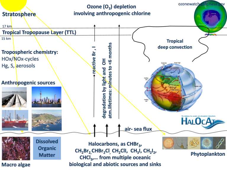 Die Arbeit der Halogenkohlenstoffgruppe zielt darauf ab, die wichtigsten treibenden Faktoren für die regionale und zeitliche Variabilität der marinen Halogenkohlenstoffverteilungen und -emissionen sowie deren Auswirkungen auf die Troposphäre und Stratosphäre zu ermitteln. Die tropischen Ozeane sind von besonderer Bedeutung, da die meisten troposphärischen Spurengase, einschließlich der ozeanischen Emissionen der kurzlebigen Halogenkohlenwasserstoffe, in den Tropen in die Stratosphäre gelangen. Sie werden durch die großräumige Zirkulation in der Stratosphäre in Richtung Winterpol transportiert und steigen schließlich in mittleren und hohen Breiten wieder in die Troposphäre ab. Tropische Prozesse beeinflussen also die chemische Zusammensetzung der gesamten Atmosphäre. In den Projekten SOPRAN, TRANSBROM, SHIVA, ROMIC-THREAT, OASIS und Astra- OMZ wurden die Verteilung der ozeanischen Halogenkohlenstoffe, ihre Quellen, ihr Austausch zwischen Luft und Meer, ihr Transport durch die Atmosphäre und ihre Auswirkungen auf die Stratosphäre untersucht. Die interdisziplinäre Zusammenarbeit mit Atmosphärenchemikern und -physikern, Biologen und biogeochemischen Modellierern untersucht derzeit die "Bedrohung der Erholung der Ozonschicht durch anthropogene Emissionen von sehr kurzlebigen Halogenkohlenwasserstoffen" und die "biologische Kontrolle von klimawirksamen Spurengasen im Oberflächenozean".