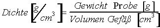 Proben und Pyknometer mehrere Stunden im Wägeraum temperieren. Pyknometer wie oben beschrieben mit Probe füllen und die Dichte der Probe nach folgender Formel bestimmen: