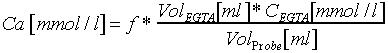 Kalibriert wird mit IAPSO-Standard der genauso titriert wird wie die Proben. Aus dem Verbrauch an EGTA-Lsg. für den IAPSO ergibt sich der f-Faktor zur Berechnung der Konzentration. Der Gehalt an Ca im IAPSO beträgt 10,55 mmol/l, daraus ergibt sich ein Sollverbrauchswert von 0,527 ml EGTA-Lsg.