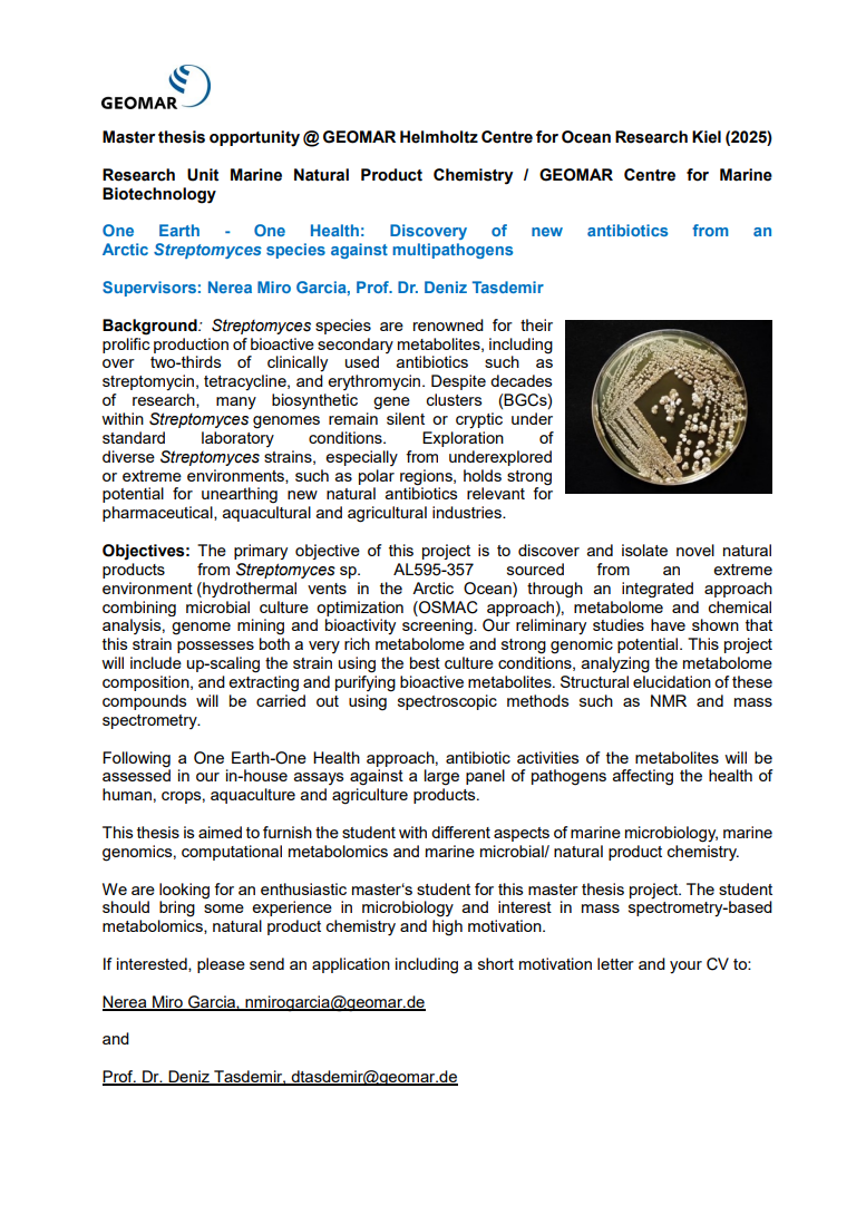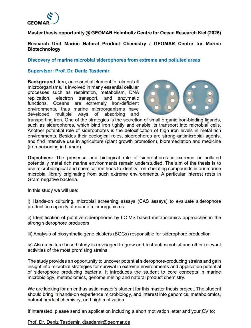 Unser erster Forschungsschwerpunkt (marine Biodiscovery/Biotechnologie/Bioprospecting) untersucht das Potenzial solcher „Designermoleküle“ für die Entdeckung neuer, bioaktiver Moleküle, die für die menschliche Gesundheit (z. B. als Arzneimittelkandidaten) oder für Anwendungen als Agrochemikalien, Nahrungsergänzungsmittel oder kosmetische Mittel relevant sind.