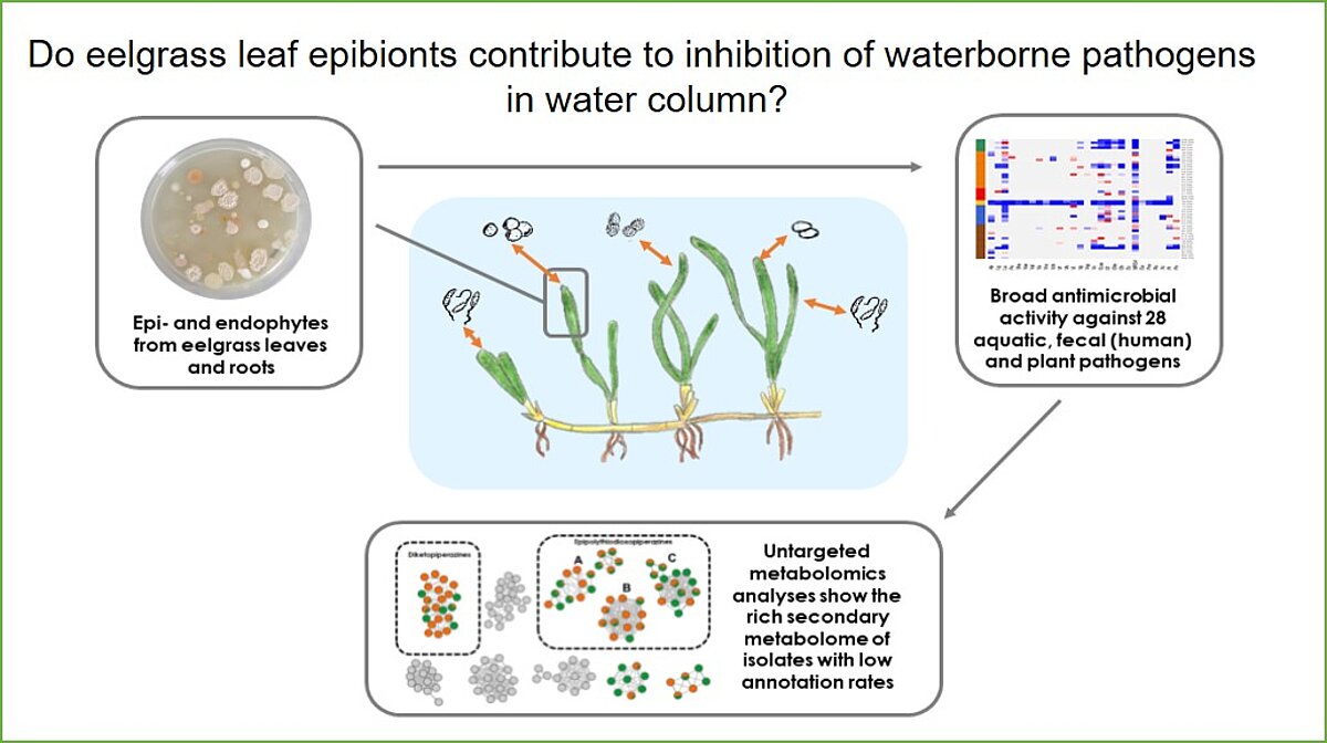 Our foci include specific extraction, identification and chemical imaging of natural molecules exuded onto surface by the host and its epibionts to control the surface biofouling. The second focus rests on the seagrasses that have been shown to reduce the pathogen load in the surrounding seawater. We are investigating interactions between seagrasses and seawater microbiome as well as the chemical mechanisms behind this newly identified ecosystem service, which is highly relevant for the health of ocean and human.