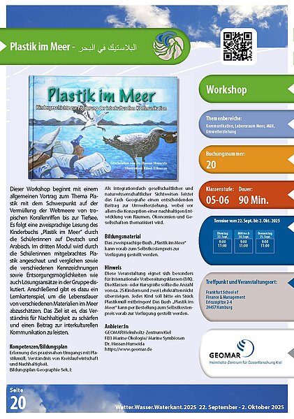 Im Rahmen von Wetter.Wasser.Waterkant.2025-Hamburg und der Zusammenarbeit mit GEOMAR - Helmholtz-Zentrum für Ozeanforschung Kiel fanden dreitägige Veranstaltungen zum Thema „Plastik im Meer“ statt. An unserem Angebot haben sechs Kassen aus sechs verschiedenen Schulen in der Hansestadt Hamburg teilgenommen. Es kamen etwa 128 Schüler/innen, begleitet von zwei bis drei Lehrkräften, zu uns, um mehr über Plastik im Meer zu wissen. Insgesamt verliefen alle Angebote gut, obwohl das Alter der Kinder herausfordernd für uns war, alle Erwartungen und Wünsche von Kindern verschiedener Niveaus zu erfüllen.