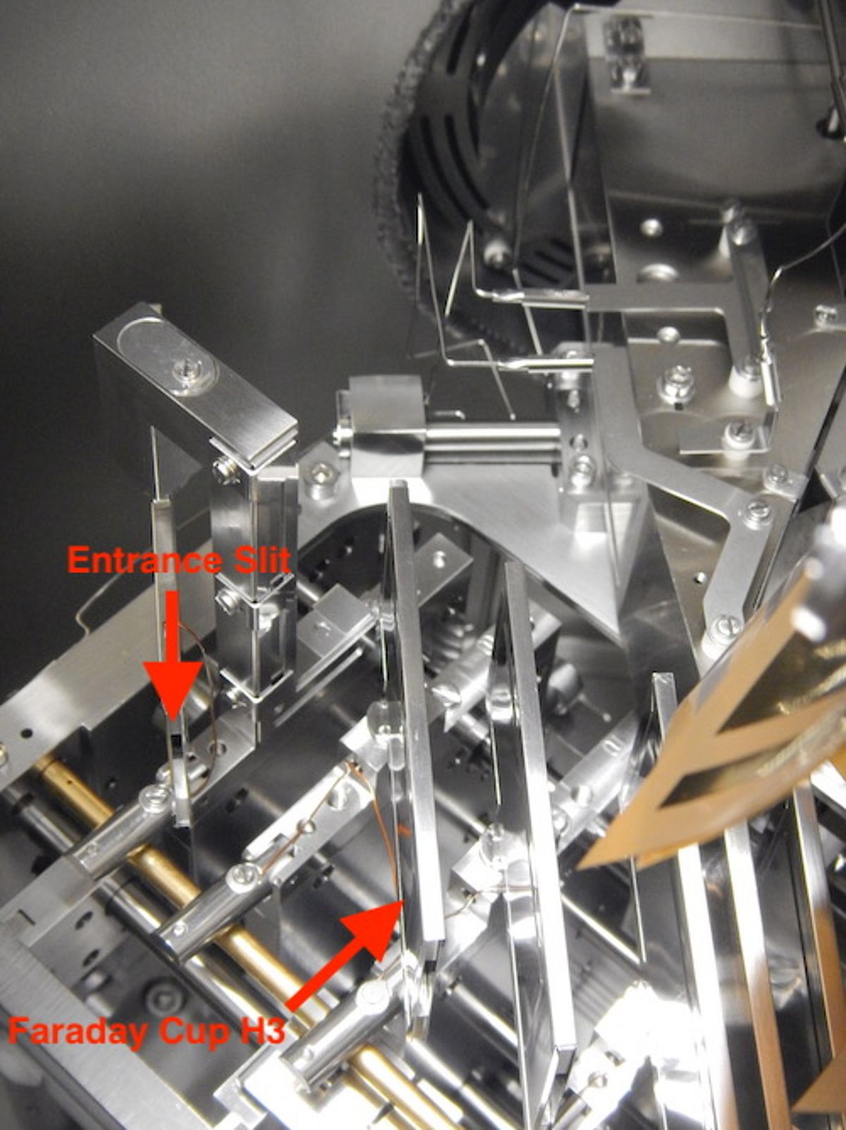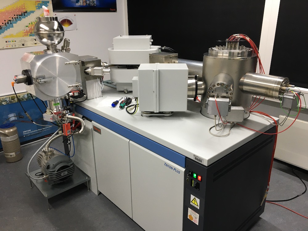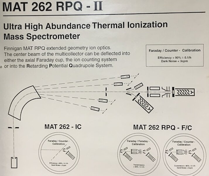 Vor der TIMS Analyse müssen die Elemente von Interesse im Reinraumlabor mit Hilfe von chromatographischen Verfahren von der Probenmatrix getrennt und aufgereinigt werden. Proben werden auf Rhenium-Filamente geladen, auf einem Magazin befestigt und in das Quellengehäuse des TIMS eingesetzt. Die Quelle wird 6 bis 12 Stunden abgepumpt, bis ein Vakuum von 1x10^-7 bis 10^-8 hPa erreicht und Filamente durch elektrischen Strom aufgeheizt werden können. Abhängig vom Ionisierungspotential von Elementen werden unterschiedliche Ströme respektive Temperaturen für die Ionisierung benötigt. Pb+, Sr+ und Nd+ benötigen jeweilig 1180-1240°C, 1350-1450°C and 1600-1800°C zur Ionisierung. In der Ionenquelle werden die Ionen über ein 10kV Potentialgefälle auf eine einheitliche Geschwindigkeit beschleunigt und durch Potentiallinsen ein fokussierter Ionenstrahl erzeugt, der dann in den Hochvakuum-Analysator (~3x 10^-9 hPa) des MS überführt wird. Dort tritt der Ionenstrahl in ein stabiles Magnetfeld, das die Ionen basierend auf Masse und Ladung auftrennt. Mit anderen Worten: Nachdem die Ionen das Magnetfeld passiert haben, ist aus dem Ionenstrahl ein Fächer massenspezifischer Ionen geworden. Bspw. wird ein Sr-Ionenstrahl in die Massen der vier natürlich vorkommenden Sr-Isotope 84, 86, 87 und 88 aufgetrennt. Die massenspezifischen Ionen werden final in Faraday-Cups gesammelt, wo sie ein elektrisches Signal erzeugen. Faraday-Cups bestehen in ihrem Kern aus Graphitschalen, in denen die Ionen elektrisch neutralisiert werden, sodass ein sehr kleiner Fluss an Elektronen im Bereich von 0.001 bis 50x 10^-11 A entsteht. Dieser Strom wird über hochohmige Verstärker (üblicherweise 10^11 Ω) abgeleitet und dabei elektrische Spannung (V = Ω x A) erzeugt, die von der Steuerungssoftware verarbeitet wird. Die Höhe der erzeugten Spannungen für die einzelnen Massen spiegelt dabei unmittelbar die Verteilung der Isotopenhäufigkeit eines Elements wider. Da die Signalintensitäten der verschiedenen Isotope eines Elements gleichzeitig im Faraday Multikollektor gemessen werden, ist das gemessene Massenverhältnis von bspw. 87/86 nichts anderes als der Quotient der elektrischen Spannungen von Masse 87 und 86. Hört sich trivial an; die Ionenströme werden jedoch ultrapräzise gemessen, sodass sich Unterschiede in der Isotopenhäufigkeit mit weniger als ≤0.0008% 2SE Messfehler für 87Sr/86Sr und 143Nd/144Nd sowie ≤0.005% 2SE Messfehler für Pb-Isotopenverhältnisse auflösen lassen.
