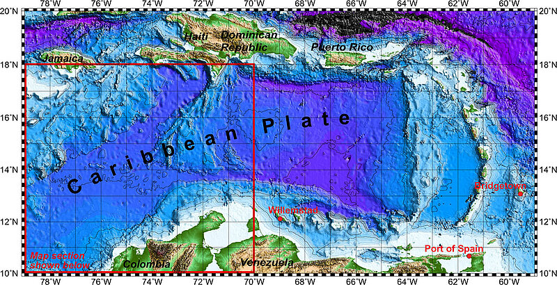 Im Rahmen des Forschungsprojektes CLIP (Caribbean Large Igneous Province) wurde im März/April 2010 die Ausfahrt M81/2AB (Port of Spain – Willemstad/Curaçao – Barbados) mit dem Forschungsschiff METEOR durchgeführt. Auf ihr sollten neue Erkenntnisse über den bisher kontrovers diskutierten Ursprung und die geodynamische Entwicklung der karibischen Flutbasaltprovinz und –Platte gewonnen werden (Abb. 1 und 2)