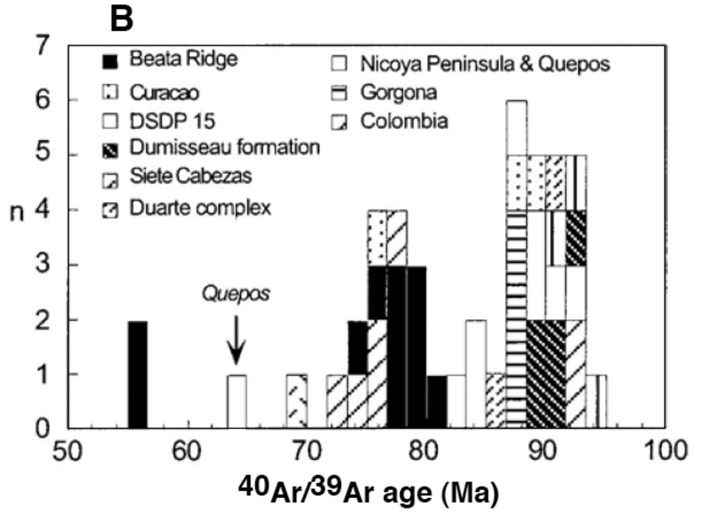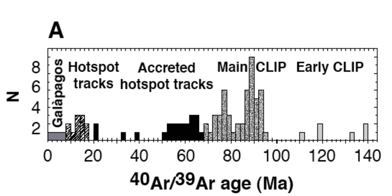 Flutbasaltprovinzen (oder Large Igneous Provinces, LIP) sind gigantische Lavaplateaus, die die volumenmäßig größten vulkanischen Ereignisse auf der Erde repräsentieren. Da sie oft den Beginn von vulkanischen Inselketten (Hotspotspuren) bilden wird angenommen, dass sie in der Initialphase eines Mantelplumes, d.h. nach Auftreffen des sogenannten “initialen Plumekopfes” auf die Unterseite einer Erdplatte, entstehen. Die Karibische Flutbasaltprovinz (CLIP) besteht aus deformierter Ozeankruste sowie aus am nordwestlichen Kontinentalrand Mittel- und Südamerikas akkretierten Flutbasalten. Erste Altersdatierungen deuteten an, dass die CLIP größtenteils vor 89±6 Ma entstanden ist. Das zeitgleiche Vorkommen von Vulkanismus identischer geochemischer Zusammensetzung überall in der karibischen Platte wurde von einigen Wissenschaftlern auf einen initialen Plumekopf des Galápagos-Hotspots zurückgeführt. Jedoch zeigen neuere Proben eine hohe geochemische Variabilität, und neuere radiometrische und paläontologische Datierungen weisen auf höhere sowie jüngere Alter hin (Abb. 3).