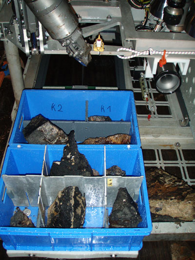 Holzplanken gehe ich zum hinteren Ende des Schiffs, wo zwischen verschiedenen rotgestrichenen Kränen und Seilwinden der ROV-Kontrollcontainer steht. Hier melde ich mich draussen, vorm Container, über Funk als Ablösung an. Eine Bestätigung knistert undeutlich durch das Walkie-Talkie, ich öffne die Tür und trete stolpernd in einen schwarzen, kühlen Raum. Nachdem sich meine Augen einigermaßen an die Dunkelheit gewöhnt haben überkommt mich das Gefühl in einem kleinen, von neun großen Bildschirmen dominierten, Cockpit zu sitzen. Auf den großen Bildschirmen ziehen abwechselnd zerklüftete, steinerne Klippen, weiße, wellige Sedimentflächen, Canyons oder einzelne aus dem Schlamm ragende Felsbrocken vorbei, langsam und lautlos, vor einem blauen Hintergrund. Helle Strahler erleuchten den Meeresboden in manchmal mehr als 4000 Meter Tiefe. Hin und wieder liegen lila Seegurken auf dem Grund, schwebt ein roter Schrimp behäbig durchs Bild, wachsen bizarre filigrane Schwämme in die Höhe. Der Tauchroboter, der diese Bilder live über ein langes Kabel in den Container sendet und auch von dort gesteuert wird, heißt ROV, remotely operated vehicle, was soviel wie ferngesteuertes Fahrzeug bedeutet. Er wird entlang einer vorher festgelegten Route gesteuert, um mit seinem beweglichen Greifarm gezielt Gesteinsproben am Meeresboden entnehmen zu können. Geschickte Piloten greifen und brechen sogar oft bis zu unterarmlange Steinbrocken aus den vom beisitzenden Wissenschaftler gewünschten Stellen. Jede Aktion, sämtliche Vermutungen des Spezialisten über Ursprung und Art, mögliche Zusammenhänge und auffällige Strukturen werden von mir in einem Laptop protokolliert. Auch Tiefe, Zeit und Position werden gespeichert um später sämtliche Informationen zu fundierten wissenschaftlichen Theorien verbinden zu können. Ich verfolge jetzt schon seit drei Stunden aufmerksam jede Bewegung des ferngesteuerten U-Boots, habe 13 erfolgreich genommene Gesteinsproben protokolliert, in welchem Fach der ausfahrbaren Probenbehälter im ROV sie abgelegt wurden, an welcher Position sie genommen wurden, ob aus dem Fels gebrochen oder aufgelesen… Nun nach etwa 8 Stunden ist das vorgegebene Profil abgearbeitet, der heutige Tauchgang abgeschlossen. Ich beende das Protokoll, packe meine Sachen und trete blinzelnd ins gleißende Sonnenlicht, während sich unter mir in über 2000 Metern Tiefe das ROV, mit den kostbaren Proben, an seinen etwa eineinhalb stündigen Aufstieg zur Wasseroberfläche macht.