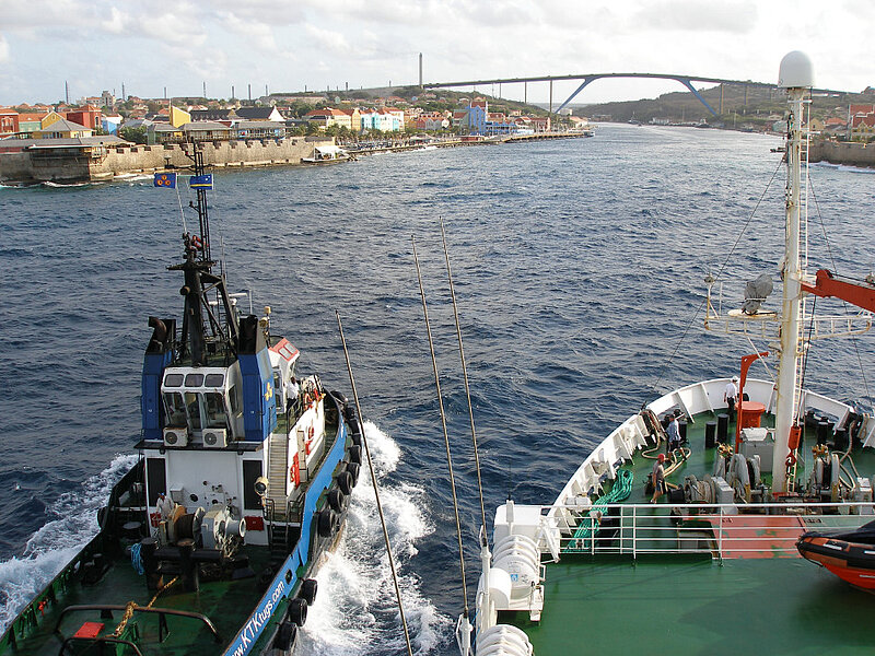 Heute früh bestätigte uns der Blick aus dem Kammerfenster: Es gibt wirklich noch Land. Nach den Wochen auf See, fernab von jeglichem Festland, ist das ein berauschender Anblick.Wir sind fünf Tage eher eingelaufen als ursprünglich geplant, da unvorhergesehene Umstände, die außerhalb unserer Kontrolle liegen, zu einer Verkürzung dieses Fahrtabschnitts führten. Der neue Plan sieht vor, dass wir in zwei Tagen, am Mittwoch, wieder auslaufen. Somit wird der anschließende Abschnitt, auf dem wir wie geplant Dredgen und Magnetikprofile fahren wollen, ein paar Tage länger.Der Blick vom Peildeck zeigt, dass die Insel Curacao hügelig ist. Palmen wehen im Wind. Wellen und Strand. Schornsteine, Industrieanlagen und Häuser säumen das Ufer. Die Hafeneinfahrt von Willemstad ist ein enger Kanal (St. Anna Baai), der zu dem Naturhafen Schootegat führt und die Stadt in zwei Hälften teilt. Gleich nach unserer Durchfahrt durch den Kanal wurde die bewegliche Schwimmbrücke wieder geschlossen. Mit der Unterstützung von zwei Schleppern wurde die METEOR sicher zu unserem Liegeplatz gleich hinter der großen Hafenbrücke geleitet. Nun warten wir darauf, dass die Immigrations-Fomalitäten abgeschlossen werden und wir an Land dürfen. In den nächsten zwei Tagen werden wir die Stadt und das Umland erkunden. Ganz oben auf der Prioritätenliste steht der Strand! Fortsetzung folgt....