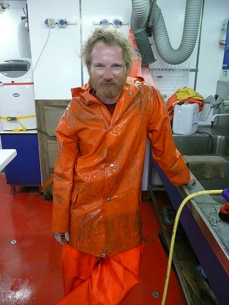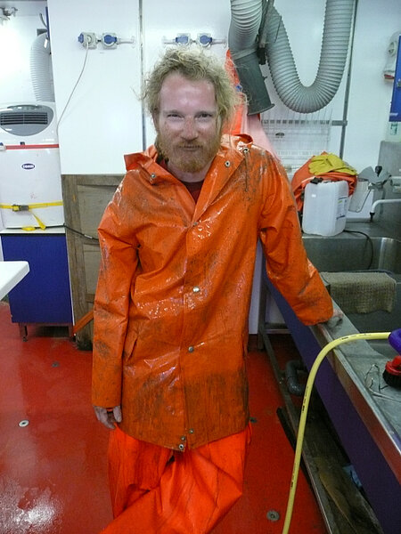 In Deutschland ist bereits seit einer Stunde Ostermontag und wir hier auf der „Meteor“ haben noch etwa 5 Stunden, bis unser Ostersonntag vorüber ist. Eigentlich habe ich ihn verschlafen, fangen wir aber mit der Nachtschicht an: 19:45 - die Nachtschicht beginnt. Ab in den Sägedress geworfen. Germanys Next Topmodel hätte gegen denjenigen, der diesen Dress trägt, keine Chance. Orangene Hose, orangene Jacke, gelbe Gummistiefel, Schutzvisier und Ohrenschützer - fertig ist das Ausgehoutfit für das Geologielabor. Aber sind wir ehrlich, einen Schönheitspreis wollen wir damit doch auch gar nicht gewinnen, wichtig ist der Arbeitsschutzfaktor und der ist in diesem Outfit einfach gegeben. Von der Brücke kommt über Funk das Signal, dass die Dredge an Bord geholt wird und wir raus aus dem Labor müssen, um als erstes die Sedimentfallen von der Dredge abzuschrauben, bevor es an die Gesteine geht. Passend zum Dredgezug überrascht uns auf Deck ein Schauer und wir sammeln die Gesteine im Regen zusammen, packen sie in blaue Transportkisten und tragen sie ins Labor. Größere Fragmente, die nicht unter unsere Gesteinssäge passen, werden mit dem Hammer zerschlagen und gehen dann ihren unvermeidlichen Gang durch die Säge. Neben Mangankrusten, Basalten, Sedimentgesteinen sind auch ein paar abgestorbene Korallenfragmente dabei. Die Gesteine werden abgespült und ich verschwinde in der Zeit in die Nasszelle, die wir bereits im ersten Fahrtabschnitt um die Säge konstruiert hatten, so dass nicht das ganze Labor vollkommen verdreckt, wenn gesägt wird. So geht jeder Stein seinen Gang durch die Säge und wird in handliche Teile zerlegt, sowie nach eingehender Untersuchung für Dünnschliffe oder Geochemie präpariert. Nach etwa 2 Stunden verlasse ich die Nasszelle und bestaune die neue Farbe des Sägedresses - schwarzbraun sieht es jetzt aus und das Orange ist mehr oder weniger verschwunden. So schmücken mein Gesicht nun nicht nur Sommersprossen sondern auch jede Menge Dreckspritzer der Säge. Eine durch und durch schmutzige Angelegenheit. Gut das niemand hier darüber meckert, wie man am Ostersonntag denn so aussehen könne.Nach der Präparation werden die Proben vermessen, fotografiert, eingepackt und in Kartons eingelagert, die dann im Container verstaut werden und auf ihre weitere Bearbeitung in Deutschland warten.Drei weitere Dredgen kamen diese Nacht noch an Bord, bevor wir unsere Arbeit an die Tagschicht übergaben. Auch die Tagschicht hatte wahrscheinlich nicht viel mehr vom Ostersonntag als wir. Nach einer ausgiebigen Dusche verschwanden wir ins wohlverdiente Bett. Zum Mittagessen trafen wir uns aber dann doch alle in der Messe wieder, auch die komplette Nachtschicht war gekommen um sich das gute Ostersonntagsessen nicht entgehen zulassen, so saßen wir in netter Runde zusammen, genossen ein paar ruhige Minuten, bevor es für uns hieß: Ab ins Bett und für die Tagschicht ab ins Labor. Wir genießen trotz reichlicher Arbeit die Zeit an Bord der „Meteor“ auch über Ostern und hoffen, dass alle daheim die Ostertage frei von Arbeit genießen konnten. Ich werde jetzt ins Labor verschwinden, heute werde ich aber keinen Schönheitspreis gewinnen, denn die Sägearbeit übernimmt heut jemand anders für mich.