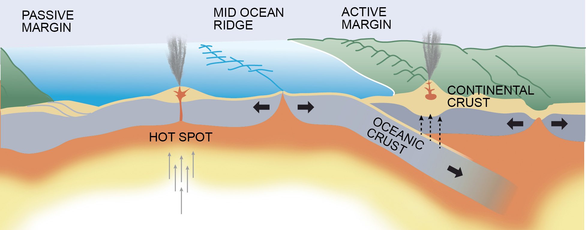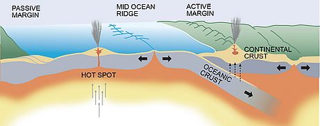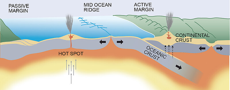 Plattentektonische Prozesse bilden, verändern und zerstören Meeresboden. Eine Vielzahl an magmatischen und tektonischen Prozessen beeinflusst die Platten während dieses Kreislaufs. Einige der Prozesse (Vulkanausbrüche, Erdbeben, Hangrutschungen) stellen eine Bedrohung für die Gesellschaft dar, während andere (z.B. Entstehung ozeanischer Kruste, Entwicklung von Sedimentbecken) wertvolle Ressourcen in und auf dem Meeresboden erzeugen. Der Abbau dieser Ressourcen kann das Wirtschaftswachstum fördern, aber auch schädliche Folgen für die marinen Ökosysteme haben. Die Ziele dieses Themenfeldes sind daher, die Entstehung und Evolution des Meeresbodens und die damit zusammenhängenden Naturgefahren und Ressourcenentstehung zu verstehen und damit zur verbesserten Einschätzung des Risiko- aber auch Ressourcenpotentials der Ozeane beizutragen. Die Herausforderung besteht dabei, Beobachtungen nicht nur mit der erforderlichen räumlichen Auflösung, sondern auch über repräsentative (große) Bereiche zu machen. Daher ist die Entwicklung und der Einsatz von innovativen Technologien in Kombination mit multidisziplinärer Modellierung erforderlich.