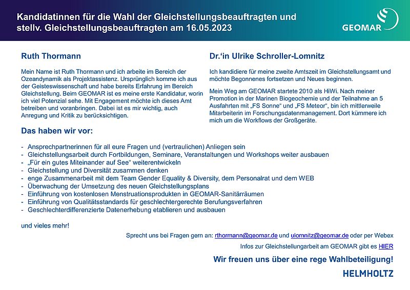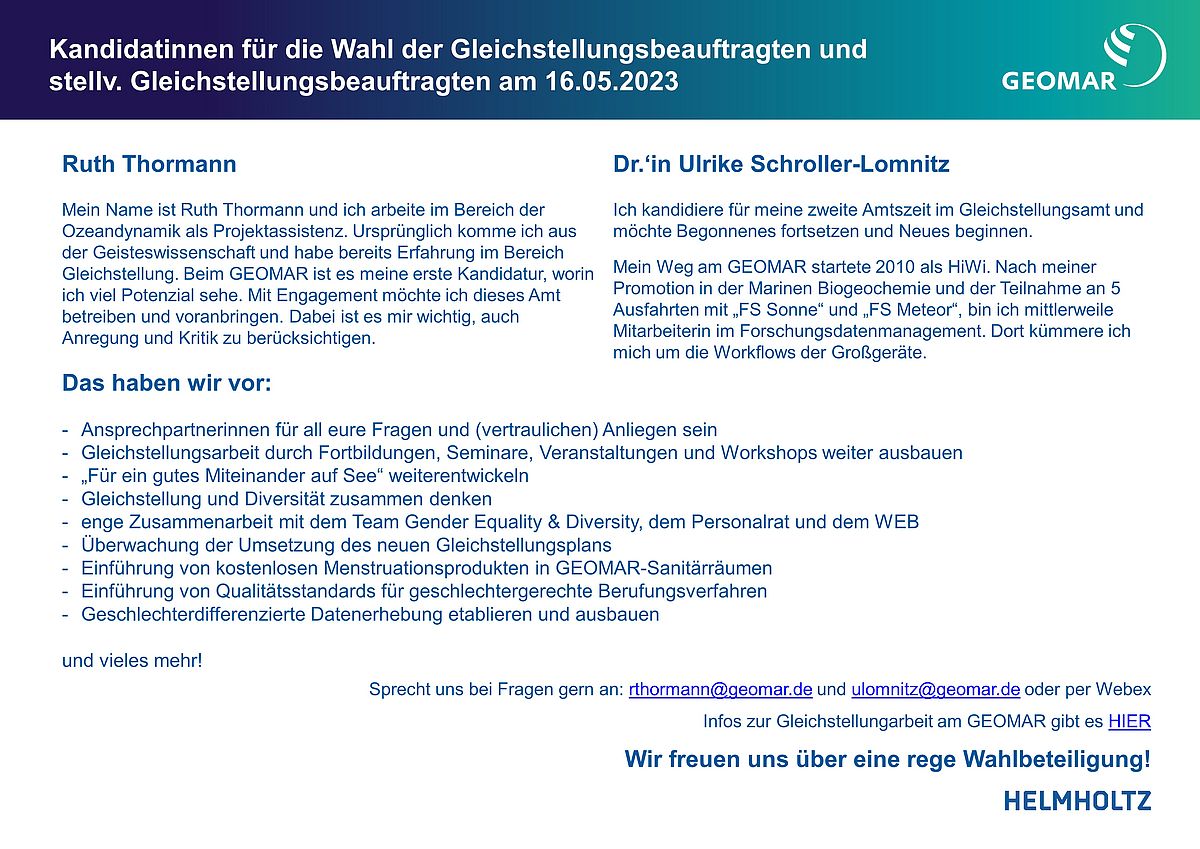 Die Gleichstellungsbeauftragte wurde am 15.5.2023 durch alle weiblichen Beschäftigten des GEOMAR nach dem geltendem Bundesgesetz (BGleiG) gewählt und durch die Institutsleitung bestellt. Die Amtszeit beträgt vier Jahre (1.6.2023 - 31.5.2027). Ein wesentliches Ziel der Gleichstellungsarbeit ist, strukturelle Benachteiligungen von Frauen durch deren gezielte Förderung zu beheben.