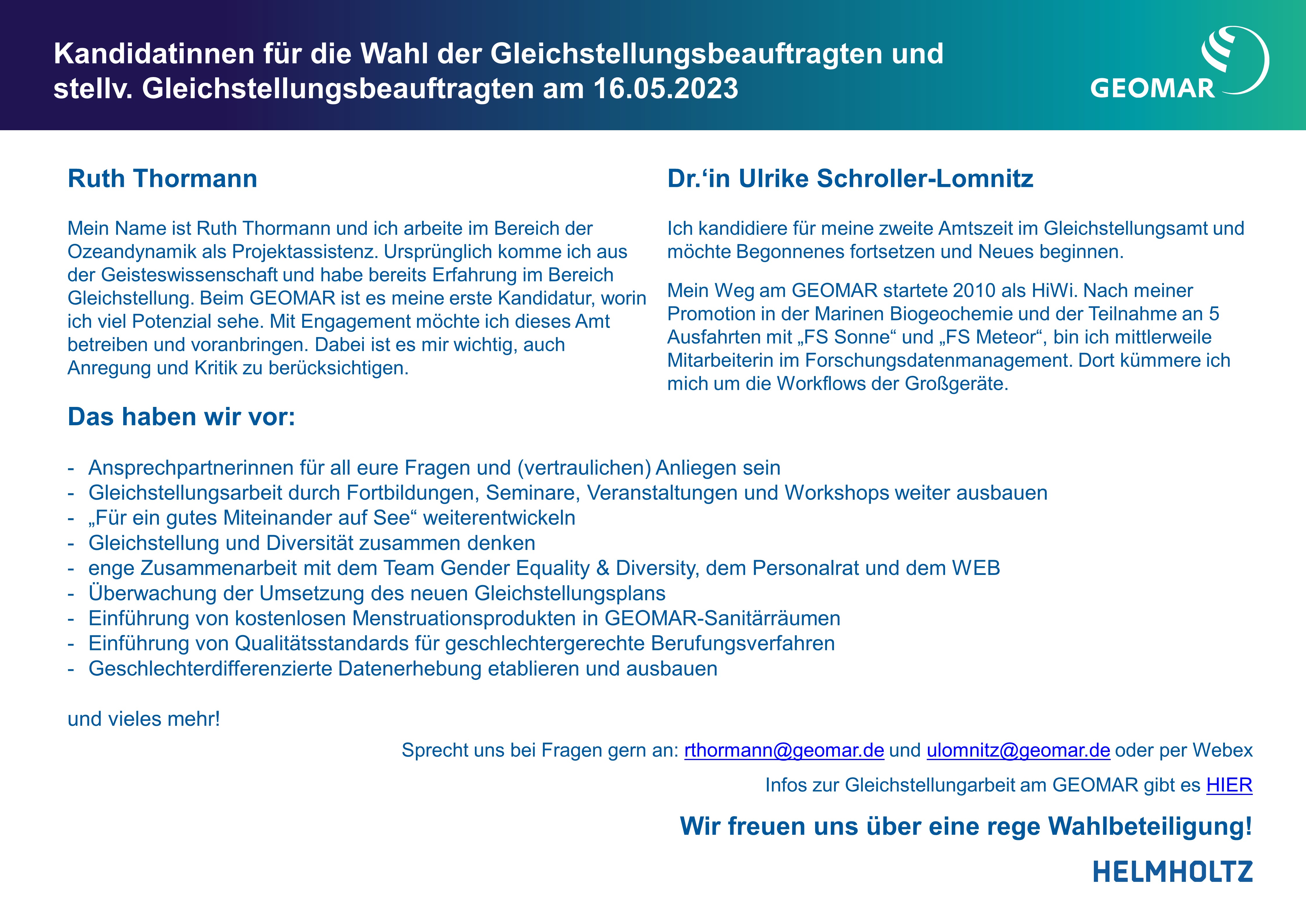 Sprechstunde nach Vereinbarung per E-Mail an gleichstellung(at)geomar.de