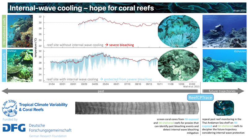 Ongoing global warming and increased prevalence and magnitude of heatwaves threaten coral reef persistence in many tropical regions wordwide by causing bleaching and mass mortality. The aim of this project is to obtain an improved understanding of the future fate of coral reefs by learning from the past. Cold water, supplied by wind-driven mixing, upwelling or breaking internal waves, has been shown to considerably enhance coral survival during marine heat waves, both at local and regional scales. However, we do not know whether cooling events occur regularly enough at specific locations to serve as a protection mechanism for reefs. A better understanding of beneficial reef cooling dynamics through time can be critical for improved reef management. Studying the coral skeletal record of past bleaching events in regions with known occurrence of cooling events will allow me to address this question. This project will focus on internal waves (IWs) in the Andaman Sea, Thailand. Here, reefs exposed to IWs have been shown to be protected from severe bleaching and mortality, in contrast to reefs sheltered from IW influence in the same region. The Andaman Sea represents an ideal natural laboratory to address the project goal, especially as multiple replicated IW-sheltered vs. IW-exposed reef sites are available. My main aims are to use the coral skeletal record to a) identify a suite of proxies that can unequivocally trace thermal bleaching stress, b) identify how internal wave forcing modulates these proxies and c) ultimately apply these proxies to coral cores that cover bleaching events during the last three decades to decipher whether IWs mitigated bleaching responses during these events. Combined with natural recovery rates from the 2010 severe bleaching (by repeating previous field monitoring of IW-sheltered as well as IW-exposed reefs) and linked with projections of future marine heat wave events, my project will enable more robust forecasts of future reef-persistence and predictions regarding the role of IW exposed reef locations as prime conservation targets.