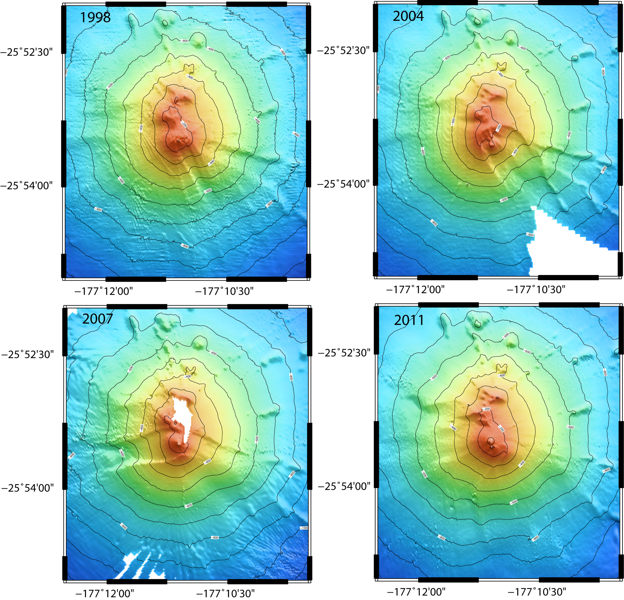 Tiefenkarten des Monowai Unterwasservulkans beruhend auf Vermessungen der Jahre 1998, 2004, 2007 und 2011. Schon aufgrund dieser Vermessungen war deutlich, dass der Vulkan zwischendurch immer wieder aktiv gewesen sein muss. Am 1. Januar 2013 erlebten Wissenschaftler des GEOMAR, die mit FS SONNE den Vulkan erneut vermessen wollten, dann live eine Unterwassereruption des Monowai. Aus Sicherheitsgründen wurde die erneute Vermessung zunächst abgebrochen. Grafik: I. Grevemeyer, GEOMAR