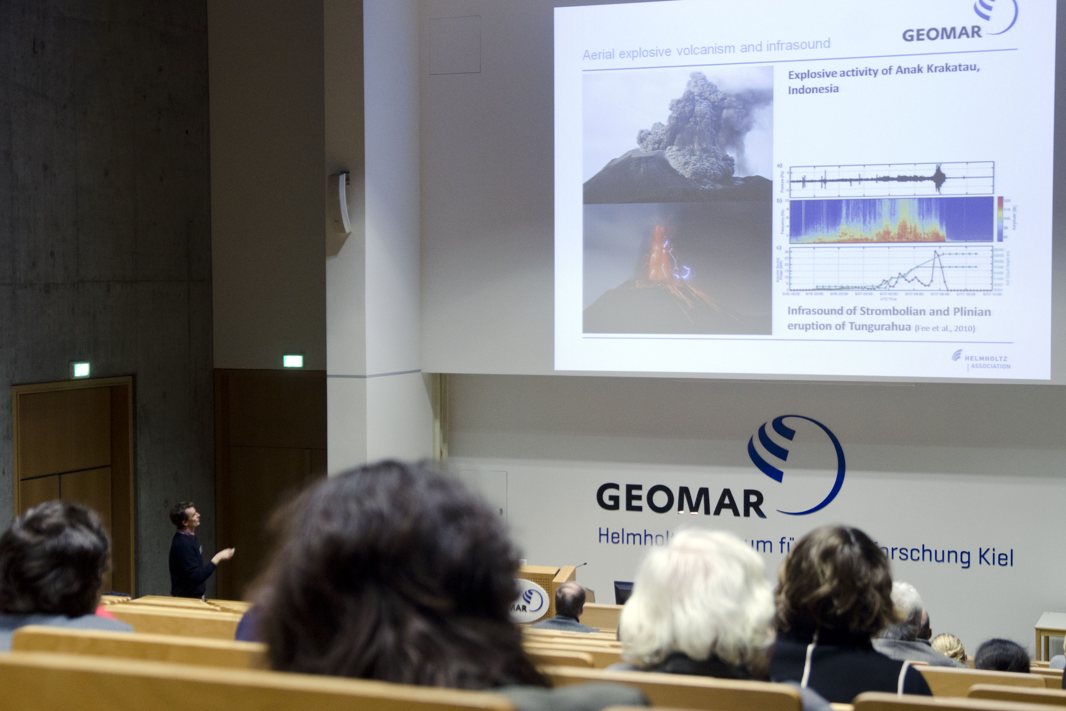 Zu den vielleicht spektakulärsten Neuigkeiten, die Wissenschaftler während des Seminars ihren Kolleginnen und Kollegen präsentieren, gehört ein Video, das erst am 1. Januar 2013 im Südwestpazifik aufgenommen wurde. Auf dem Rückweg vom Manihiki-Plateau nordöstlich von Tonga wollte ein Team des GEOMAR den Monowai-Unterwasservulkan rund 720 Seemeilen nördlich von Neuseeland vermessen. „Noch während der Vermessungsarbeiten hörten wir plötzlich Geräusche wie Kanonenschläge im Wasser und die Wasseroberfläche hob sich mehrmals wie bei der Explosion von Unterwasser-Bomben“, berichtet der damalige Fahrtleiter Dr. Reinhard Werner. Der Monowai brach etwa 50 Meter unterhalb der Wasseroberfläche aus. Aus Sicherheitsgründen wurde die Vermessung abgebrochen, doch Videoaufnahmen dokumentieren die Auswirkungen des Ausbruchs über Wasser. „Solche Aufnahmen eines ausbrechenden Vulkans knapp unter der Meeresoberfläche sind extrem selten“, betont Dr. Werner.