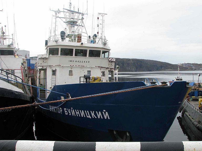 Das russische Forschungsschiff VIKTOR BUYNITSKKIY. Gut einen Monat lang legen deutsche und russische Forscher mit ihm Beobachtungsstationen in der ostsibirischen Laptevsee aus. Foto: H. Kassens, GEOMAR