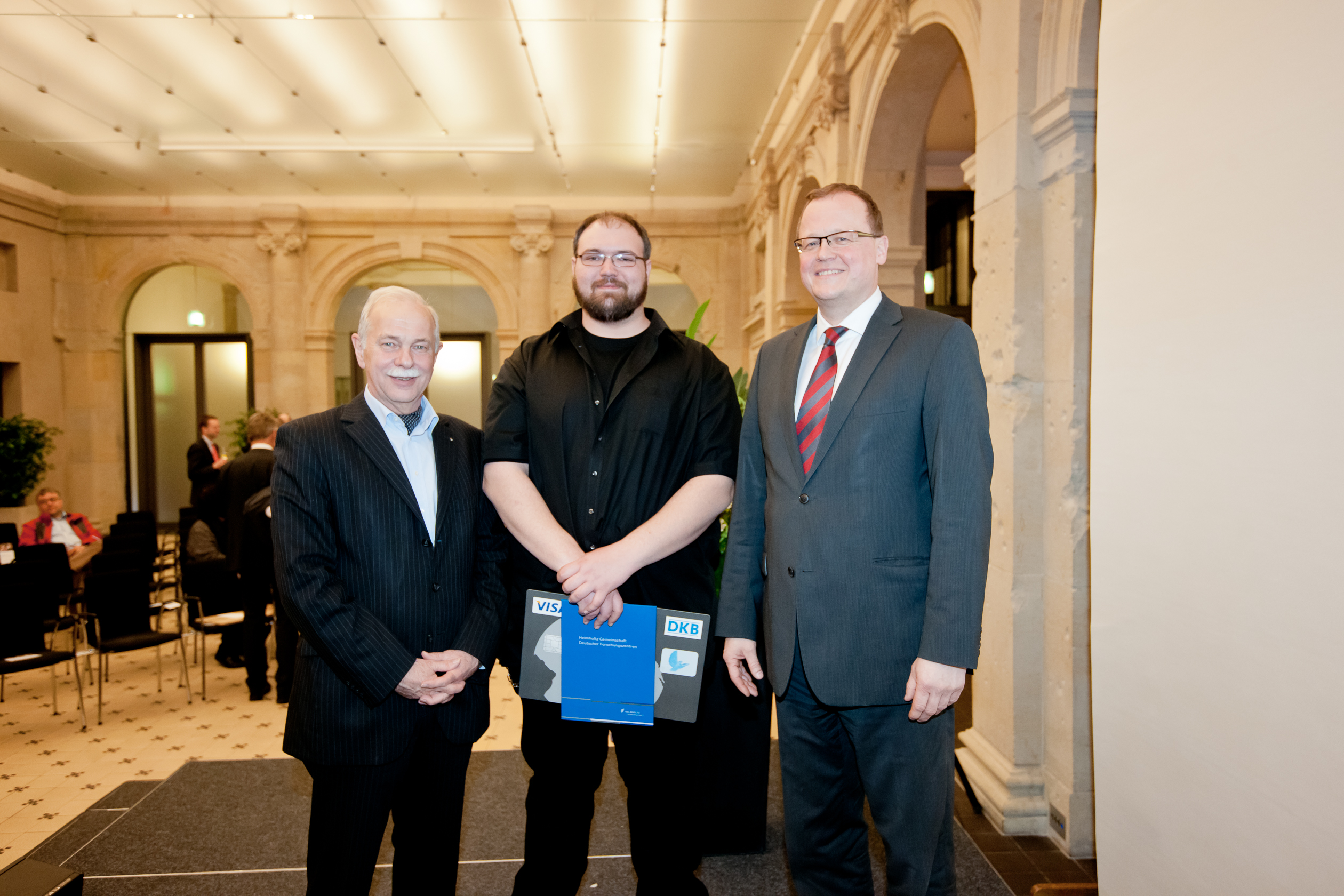 Preisträger Alexander Schwerdt (Mitte) mit Prof. Dr. Jürgen Mlynek (l) und Thomas Jebsen (r). Foto: HEIDI SCHERM FOTOGRAFIE / Helmholtz