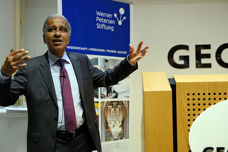 Neben technischen und kulturellen Projekten fördert die Prof. Dr. Werner-Petersen-Stiftung in besonderem Maße die Wissenschaft und insbesondere die Meeresforschung. Seit nunmehr 9 Jahren vergibt die Stiftung jährlich zwei Exzellenzprofessuren an international renommierte Wissenschaftlerinnen und Wissenschaftler auf dem Gebiet der Meeresforschung. In seiner Laudatio hob der Klimaforscher Prof. Dr. Mojib Latif vom GEOMAR die besonderen Leistungen von Arved Fuchs hervor. „Mit seinen Büchern, Bildern und Filmen entführt er uns zum einen in eine faszinierende, für viele unbekannte und unerreichbare Region unseres Planeten, zum anderen weißt er auch sehr deutlich auf den Klimawandel, der insbesondere in den polaren Breiten sehr rasch voranschreitet hin“, so Prof. Latif.
