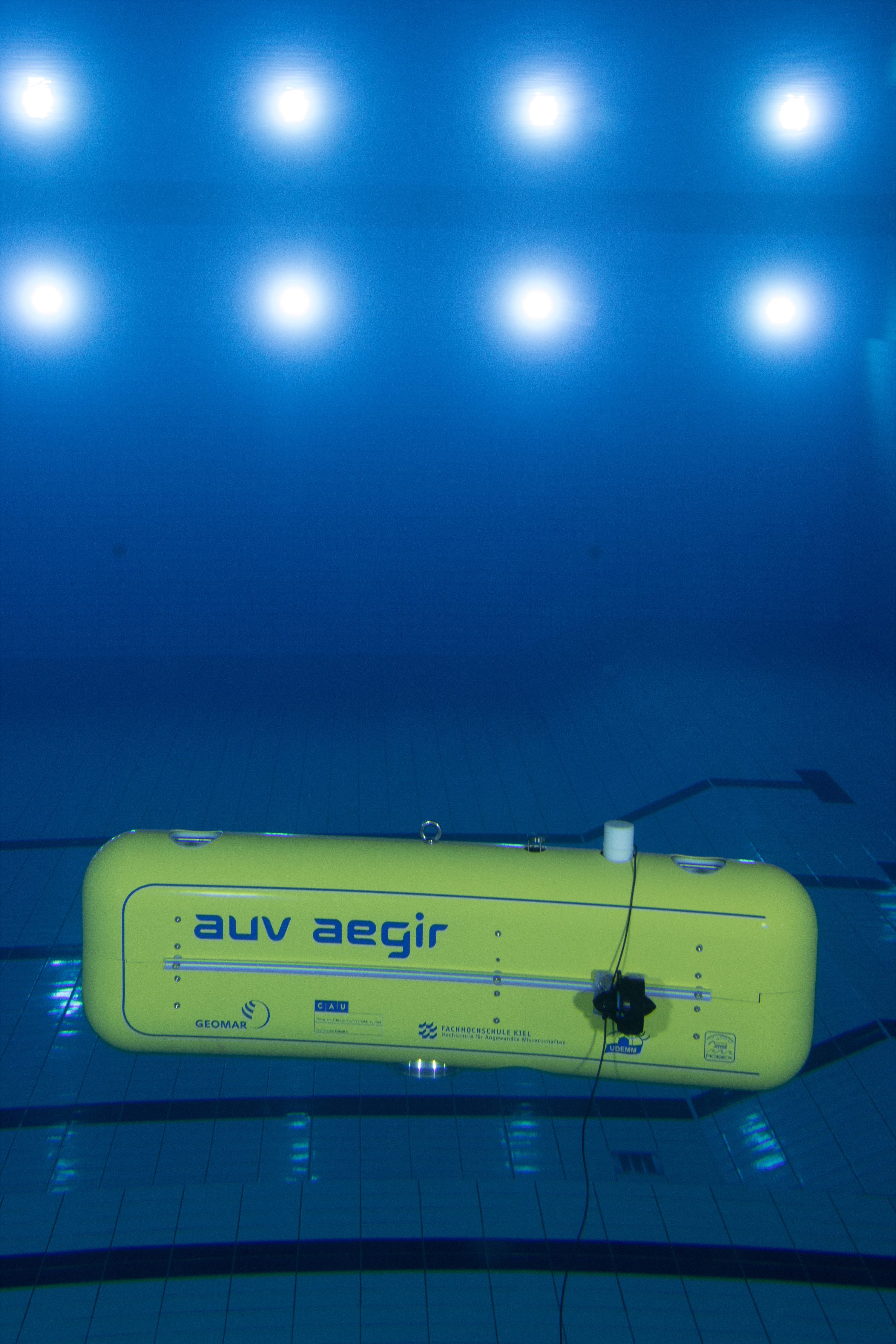 Bald schon soll sich das Unterwasserfahrzeug AUV AEGIR autonom in Wassertiefen bis maximal 200 Meter frei durchs Meerwasser bewegen und dabei auch bei geringen Geschwindigkeiten stabil tauchen und navigieren. Doch noch befindet sich das am GEOMAR Helmholtz-Zentrum für Ozeanforschung Kiel entwickelte Gerät in der Versuchsphase. Jetzt wurde die autonome Manövrierfähigkeit des AUV AEGIR erstmals in einem Schwimmbecken der Christian-Albrechts-Universität zu Kiel getestet – mit Erfolg.
