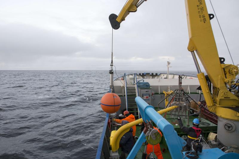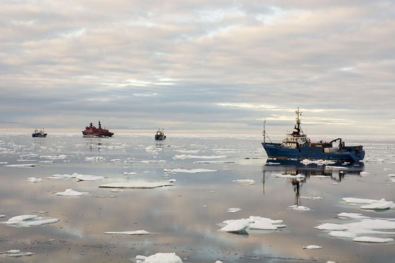 Starthafen für beide Expeditionen war Archangelsk am Weißen Meer. In einem zehntägigen Transit fuhren die Wissenschaftler mit der VIKTOR BUYNITSKIY von dort durch die Barentssee, vorbei an Nowaja Semlja und durch die Karasee, bis sie die Wilkizkistraße erreichten. Die Meerenge stellte jeweils die letzte Etappe auf dem Weg zum eigentlichen Untersuchungsgebiet, der Laptewsee, dar. Damit folgten die Wissenschaftler der legendären Nordostpassage, die aufgrund des voranschreitenden Klimawandels für immer längere Zeiten im arktischen Sommer befahrbar ist. In Engpässen wie der Wilkizkistraße können sich trotzdem nach wie vor Treibeisbarrieren bilden. Deshalb begleiten große Eisbrecher wie der Atomeisbrecher YAMAL (hier an den roten Aufbauten zu erkennen) die Schiffkonvois, die die Meerenge passieren wollen.