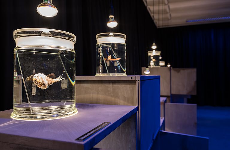 Die Exponate der Basler Tiefseeausstellung stammen aus der Sammlung von Dr. Johannes Kinzer. Der Meeresbiologe und ehemalige Aquariumsleiter des Kieler Instituts für Meereskunde (IfM) sammelte diese Tiefseefische während zahlreicher Expeditionen in den 1960er und 1970er Jahren im Atlantik, Pazifik und im Indischen Ozean.