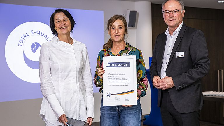 Bereits zum dritten Mal durfte Nikole Lorenz (m.) das TOTAL E-QUALITY-Prädikat für das GEOMAR entgegennehmen. Hier mit den TEQ-Vorstandsvorsitzenden Dr.in Ulla Weber und Udo Noack bei der Verleihungszeremonie in Dortmund. Foto: Sarah Rauch, TOTAL E-QUALITY Deutschland e.V.