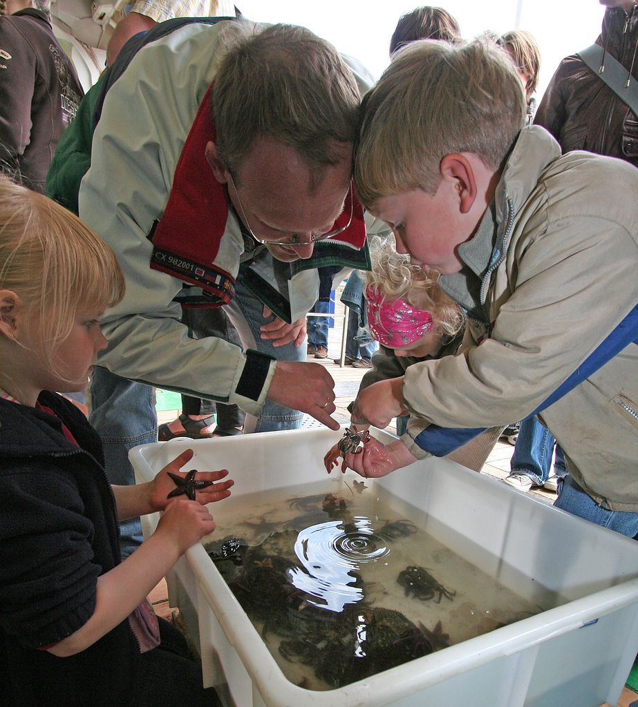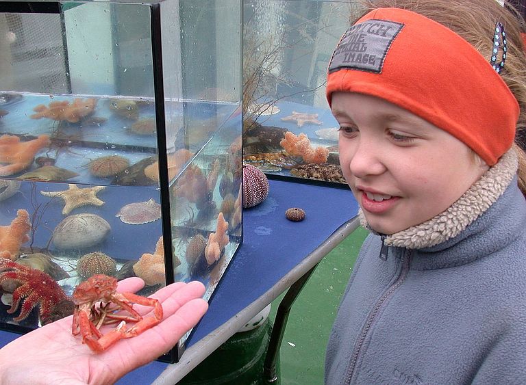 Wer wohnt in einer Muschel, wie fühlt sich ein Seestern an, wie unterscheidet man Weibchen und Männchen bei den Krebsen? Heidi Gonschior vom Kieler Leibniz-Institut für Meereswissenschaften (IFM-GEOMAR) und ihr Team wissen alles über die heimischen Meeresbewohner. Um dieses Wissen auch Kindern zu vermitteln, die fern von der Küste leben, bringen sie sogar echte Meerestiere mit nach Berlin ins Paul-Löbe-Haus. „Hier dürfen die Lütten nicht nur gucken, sondern auch Anfassen ist erlaubt“, betont Heidi Gonschior. Sie freut sich schon auf viele wissbegierige kleine „Meeresforscher“. Wer mag, kann sein Lieblingsmeerestier auch auf ein Stück Papier bannen.