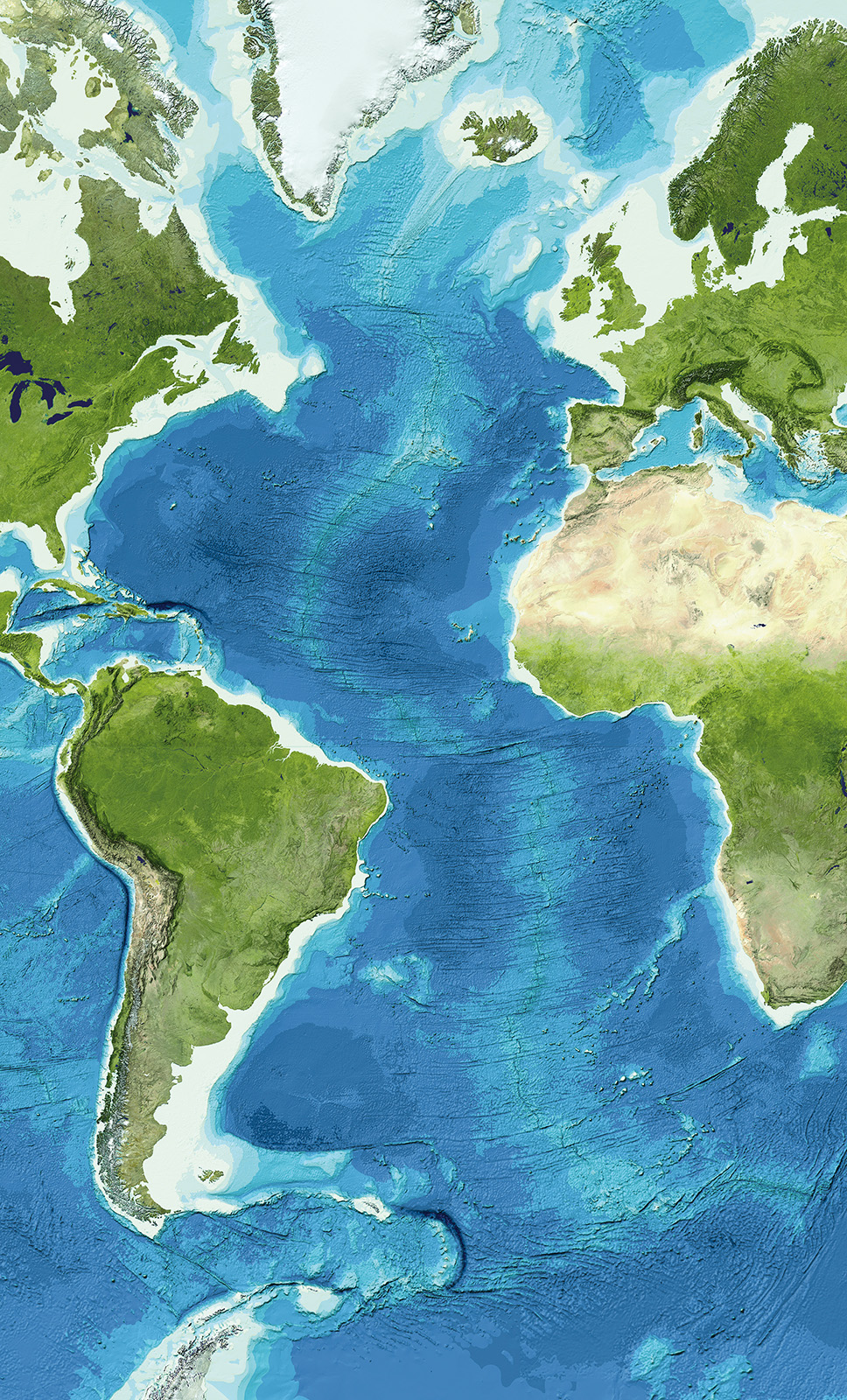Der Atlantik beeinflusst stark das Leben auf allen angrenzenden Kontinenten. Image reproduced from the GEBCO world map 2014, www.gebco.net