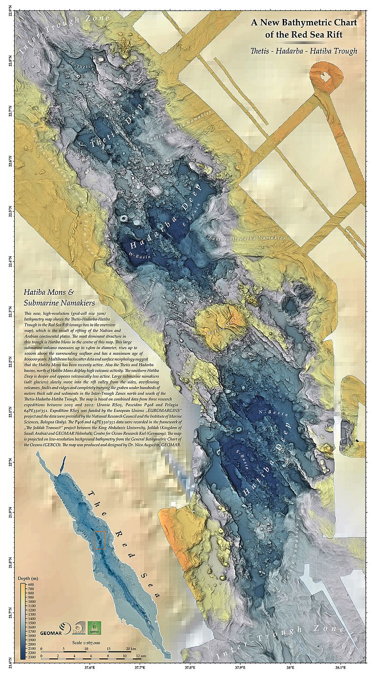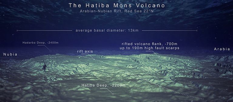 Dabei fanden sie zahlreiche Strukturen, die auch für ältere, sich langsam spreizende Ozeanbecken wie im Atlantik oder im Arktischen Ozean typisch sind. Zu diesen Strukturen zählen tiefe Bruchtäler, lange vulkanische Rücken, steile Verwerfungen und stark gestörtes Terrain. Auch die Formen der Vulkane am Meeresboden ähneln denen an älteren mittelozeanischen Rücken, die in den großen Ozeanen die Bruchzone zwischen den Erdplatten markieren. „Mit dem Tethis-Dome, dem Hatiba Mons und dem Aswad-Dome liegen gleich drei große Vulkane direkt auf der Spreizungsachse im zentralen Roten Meer, was eine typische Erscheinungsform lang andauernder und fokussierter magmatischer Aktivität magmatischer Aktivität an derartigen Grabenbrüchen ist“, sagt Dr. Froukje van der Zwan, Koautorin der Studie.