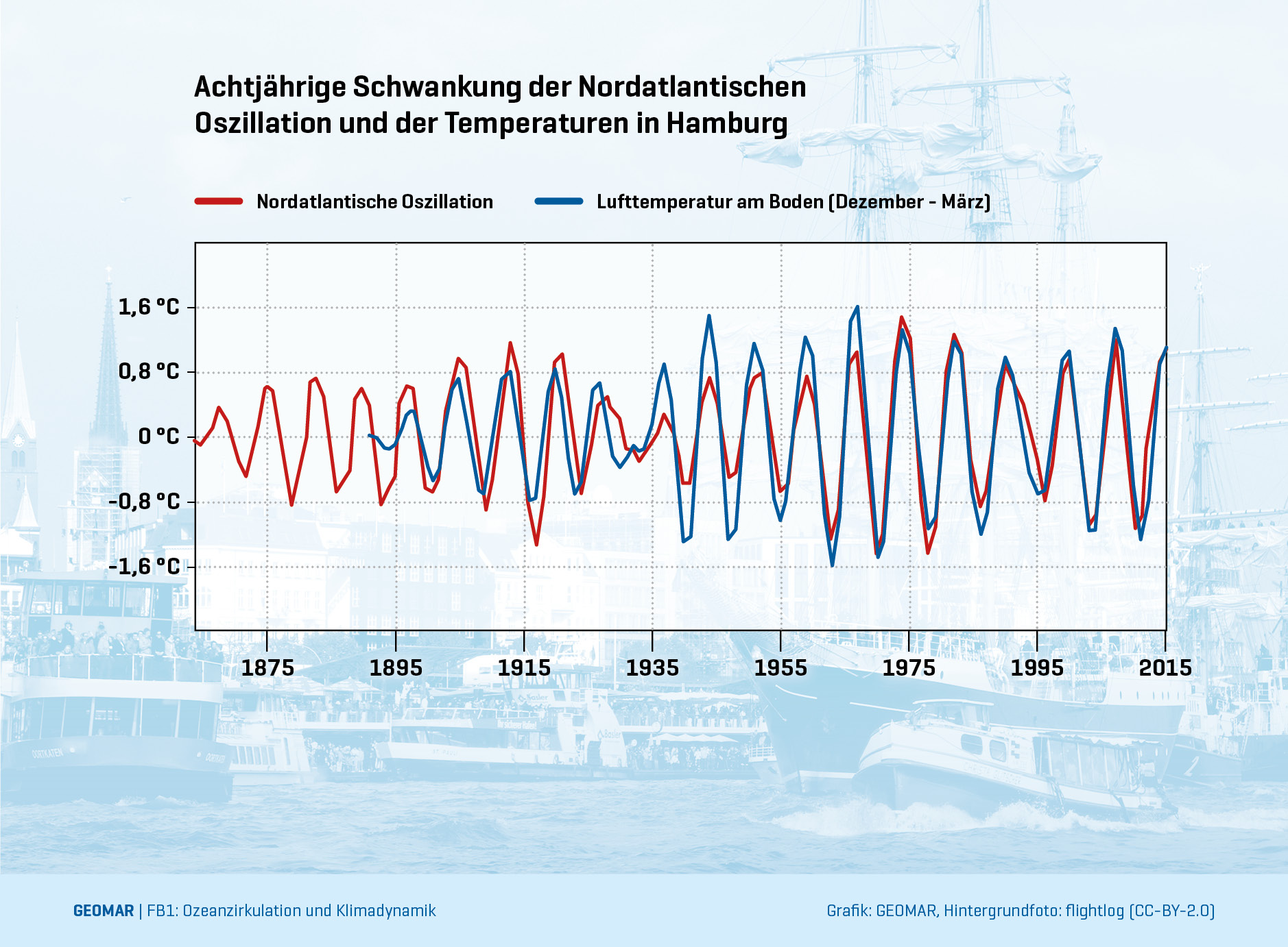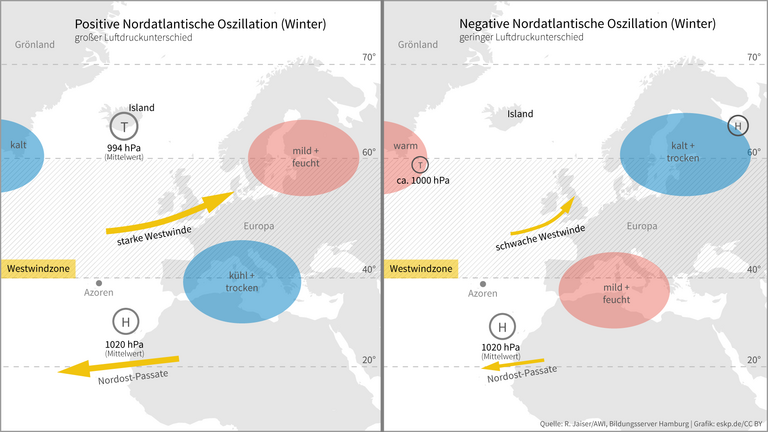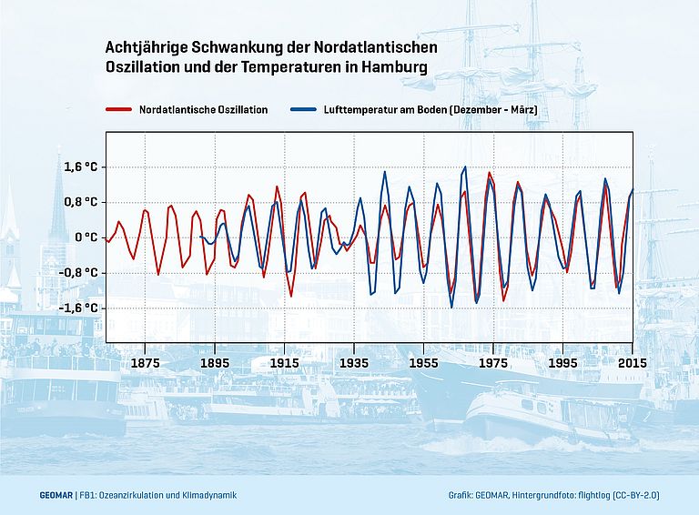 Wie das Wetter in Europa wird, entscheidet sich zu großen Teilen über dem Nordatlantik. Gerade das Winterwetter ist davon abhängig, wie stark das typische Hochdruckgebiet über den Azoren und sein Gegenstück, das Islandtief, ausgeprägt sind. Ist der Druckunterschied groß, sind die Westwinde über dem Atlantik stark und in Norddeutschland ist es beispielsweise nass und mild. Ist er schwach, herrschen dagegen trockene und kalte Bedingungen. Der Gegensatz zwischen beiden Drucksystemen ist eine so wichtige Größe, dass Meteorologen ihm einen eigenen Namen gegeben haben: NAO-Index. Die Abkürzung NAO steht für Nordatlantische Oszillation, denn die Druckgegensätze zwischen den beiden Gebieten sind sehr variabel. Sie oszillieren – schwanken – über sehr verschiedene Zeiträume hinweg, die von wenigen Monaten bis zu mehreren Jahrzehnten dauern. Eine dieser Schwingungen dauert rund acht Jahre. Der Einfluss der NAO auf Nordeuropa ist so direkt, dass sich die Periode z. B. in den durchschnittlichen Wintertemperaturen Hamburgs wiederfindet. Was genau diese Schwingung auslöst, ist bisher aber noch umstritten.