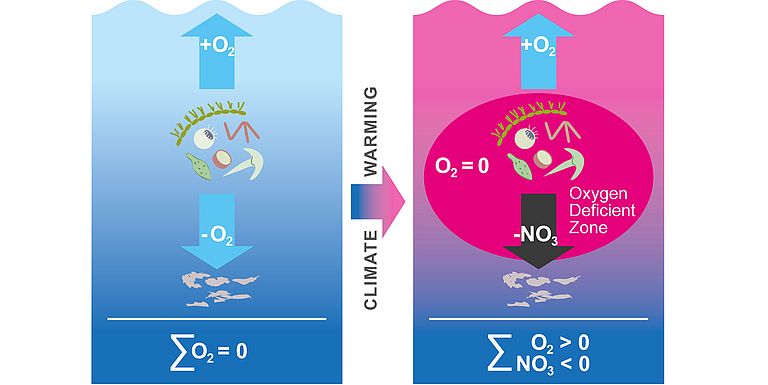 Aus Untersuchungen des Kieler Sonderforschungsbereich 754 ist bekannt, dass solche sauerstoffarmen Gebiete zwar Todeszonen für größere Organismen wie Fische oder Kopffüßer sind. Bestimmte Bakterien, die statt Sauerstoff Nitrat atmen, gedeihen dort aber sehr gut. „Sie ziehen ihre Energie aus einem chemischen Prozess, den wir Denitrifizierung nennen. Er ist ein wichtiger Bestandteil des Stickstoffkreislaufs, führt aber dazu, dass bei der Veratmung von organischem Material weniger Sauerstoff verbraucht wird, als bei der Photosynthese produziert wurde“, erklärt Professor Oschlies.