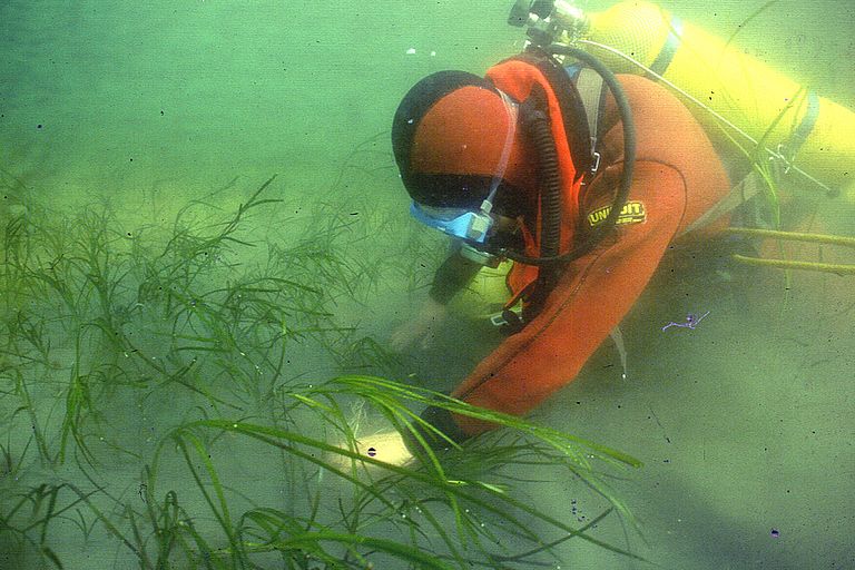 Taucher erforscht Seegraswiese in der Kieler Bucht. Foto: T. Reusch, GEOMAR