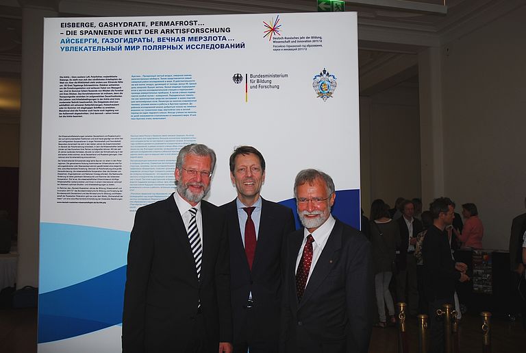 Heute eröffneten der Staatssekretär Dr. Georg Schütte, Bundesministerium für Bildung und Forschung, Prof. Dr. Wolfgang Wägele, Direktor des zoologischen Forschungsmuseums Alexander Koenig, und Prof. Dr. Peter M. Herzig, Direktor des GEOMAR | Helmholtz- Zentrum für Ozeanforschung Kiel, im Zoologischen Forschungsmuseum Koenig in Bonn die Wanderausstellung „Deutsch-Russische Meeres- und Polarforschung - Brennpunkte der Zusammenarbeit“. Sie trägt den Beinamen „Lebende Ausstellung“, weil aktuelle Projekte und Ergebnisse der exzellenten Forschung nicht nur anhand von Tafeln und einer begehbaren Arktis-Karte erklärt werden, sondern zusätzlich 14 Wissenschaftlerinnen und Wissenschaftler ihre Projekte mit den Museumsbesuchern sowohl in deutscher als auch in russischer Sprache diskutieren.