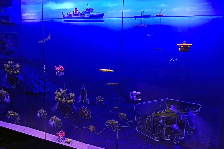 Neben einigen Originalgeräten verdeutlicht im »Space Pavilion« ein großes Diorama mit Modellen zahlreicher schon bewährter und zukünftiger Tiefseetechnologien die Herausforderungen, vor denen die Wissenschaft im Ozean steht. So sind unter anderem Modelle des kabelgesteuerten Tiefseeroboters ROV PHOCA, des Crawlers VIATOR, des autonomen Unterwasserfahrzeugs AUV ABYSS und von Deutschlands einzigem Forschungstauchboot JAGO zu sehen.
