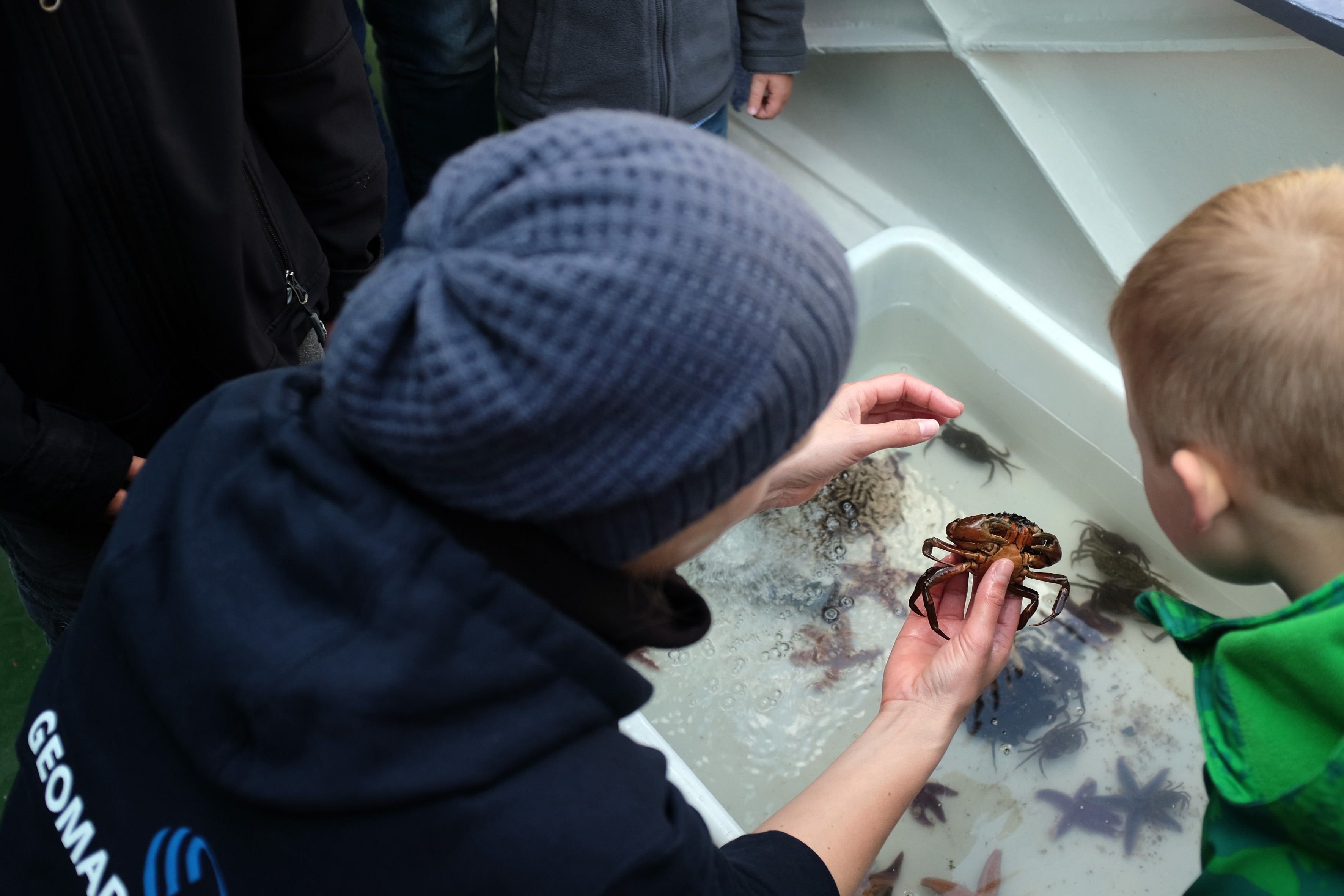 Am Anfang zeigen die Gesichter oft Skepsis oder sogar Ablehnung. Wenn Heidi Gonschior vom GEOMAR Helmholtz-Zentrum für Ozeanforschung Kiel Kinder und Erwachsene ermuntert, einen Seestern zu berühren oder mal eine Strandkrabbe in die Hand zu nehmen, muss sie meistens erst Überzeugungsarbeit leisten. Doch fast immer siegen bei Groß und Klein die Neugier und die Faszination für diese uns so fremden Lebewesen. Dann lassen sich die Kinder geduldig erklären, woran man bei Krabben den kleinen Unterschied erkennt und wie ein Seestern an sein Futter herankommt – und die Eltern lauschen ebenso gebannt.
