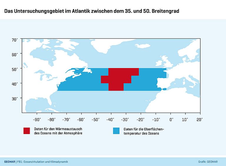 Untersuchungsgebiet im Nordatlantik, Temperaturdaten stammen aus dem dunkelblauen, Wärmeflussdaten aus dem roten Gebiet. Grafik: C. Kersten, GEOMAR.