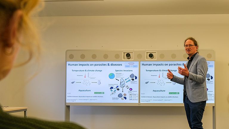 Im Rahmen seiner Exzellenz-Professur sprach Professor Dr. David Thieltges in Kiel mit Studierenden über seinen Werdegang und seine Forschungsarbeit. Foto: Ilka Thomsen/GEOMAR