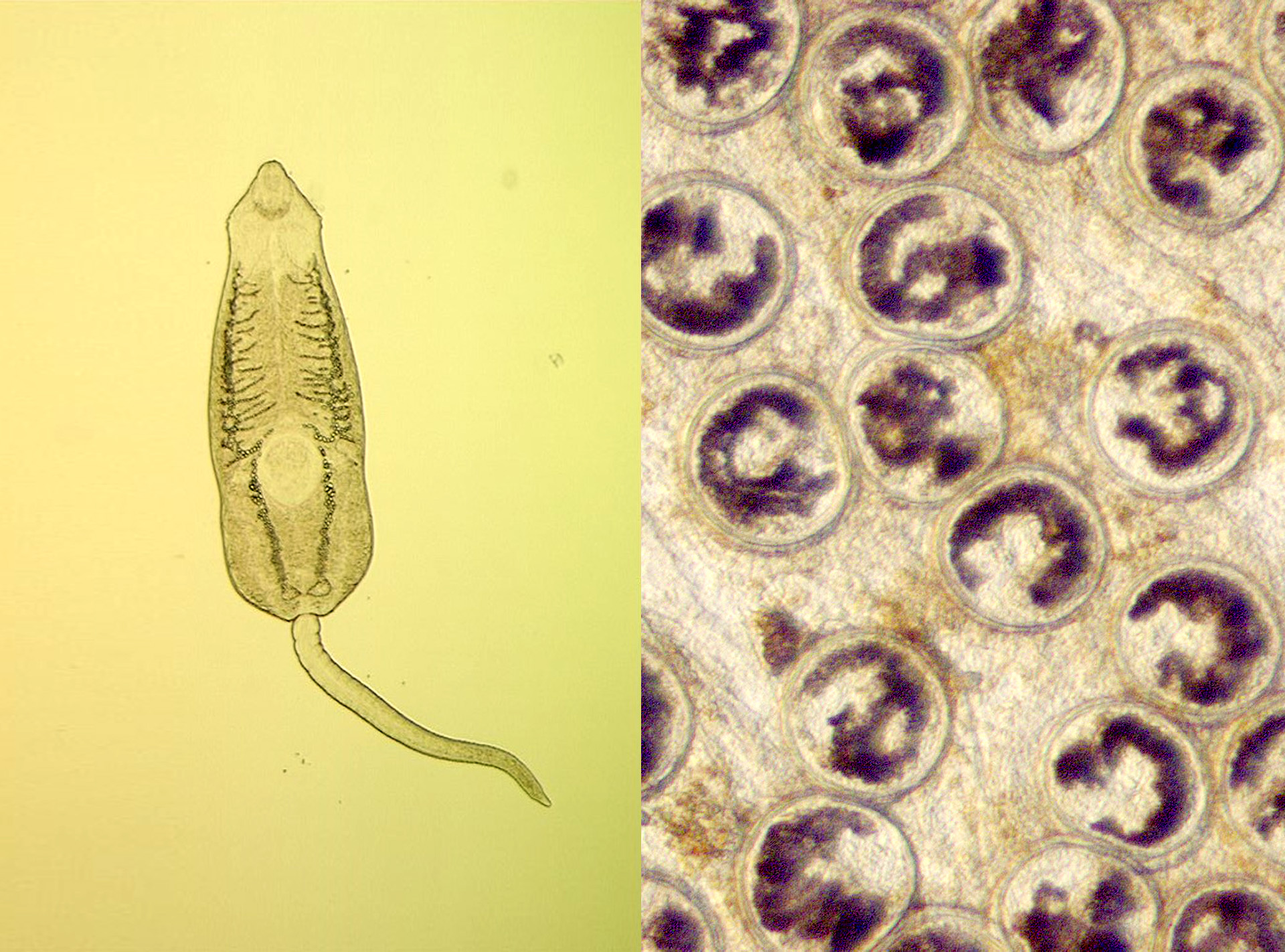 Zerkarie (links) und Metazerkarie (rechts), zwei Stadien von parasitären Saugwürmern. Auf dem Weg vom ersten zum zweiten Zwischenwirt, werden sie von einer Vielzahl von Organismen gefressen oder anderweitig aus dem Wasser entfernt, ohne dass diese selber als Wirte dienen. Fotos: Katrin Prinz, David Thieltges/NIOZ