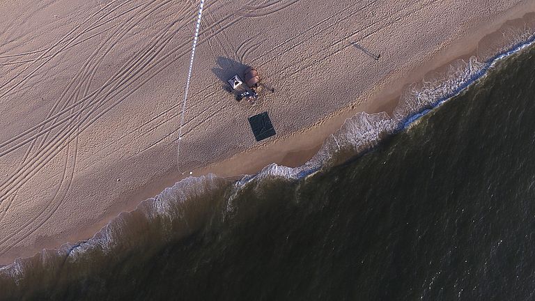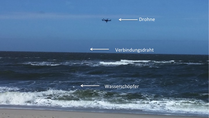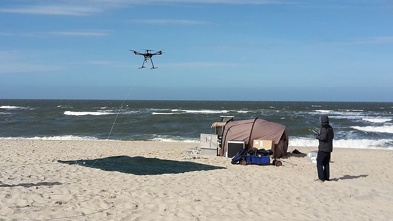 Anfang April war es endlich soweit: Eine DJI Matrice 600 Drohne wurde genutzt, um Proben an der Westküste der Insel Sylt zu nehmen. „Wir hatten sehr variable Wetterbedingungen mit Windgeschwindigkeiten von mehr als 10 m/s, bei denen sich die Drohne sehr gut bewährt hat“, erläutert die Projektleiterin Dr. Birgit Quack vom GEOMAR. „Am ersten milden Tag fragte eine Spaziergängerin noch, ob man das Ganze nicht auch im Sommer und einem Schwimmer erledigen könnte. An den folgenden stürmischen Tagen mit hohen Brandungswellen fragte niemand mehr, außer uns war eigentlich auch fast niemand mehr da“, schmunzelt Dr. Quack.
