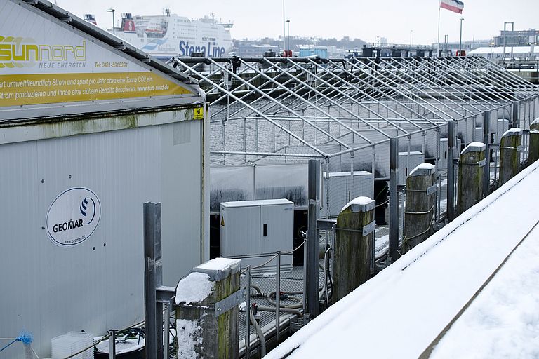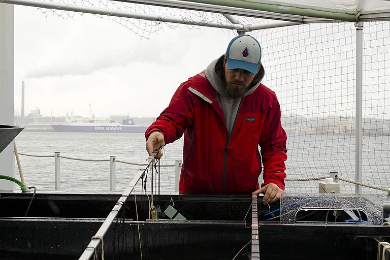 Mit diesen Fragen beschäftigt sich eine auf über drei Jahre angelegte Versuchsreihe, die in der vergangenen Woche direkt vor der Haustür des GEOMAR Helmholtz-Zentrums für Ozeanforschung in Kiel startete. Dort sind an der Kieler Hafenpromenade, der sogenannten „Kiellinie“, auf einem Ponton sechs Versuchsbehälter befestigt. In ihnen lassen sich küstennahe Ökosysteme simulieren. In zahlreichen Vorversuchen wurde die komplizierte Technik dieser „Benthokosmen“ überprüft und weiterentwickelt, bis sie den wissenschaftlichen Anforderungen entsprach.