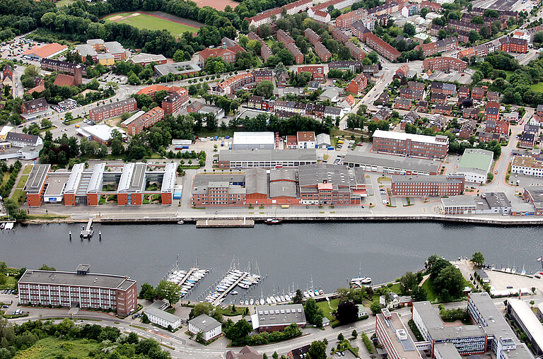 Luftaufnahme des GEOMAR-Neubaus mit Forschungsschiff ALKOR vom Mai 2021. Foto: Jens Klimmeck, GEOMAR