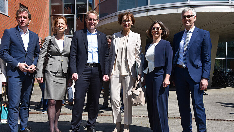 Vor der feierlichen Einweihung des GEOMAR-Neubaus: Dr. Ulf Kämpfer, Oberbürgermeister der Stadt Kiel, Karin Prien, Forschungsministerin des Landes Schleswig-Holstein, Daniel Günther, Ministerpräsident des Landes Schleswig-Holstein, Bettina Stark-Watzinger, Bundesministerin für Bildung und Forschung, Prof. Dr. Katja Matthes, Direktorin des GEOMAR, Frank Spiekermann, Verwaltungsdirektor des GEOMAR (v.l.). Foto: Thomas Eisenkrätzer