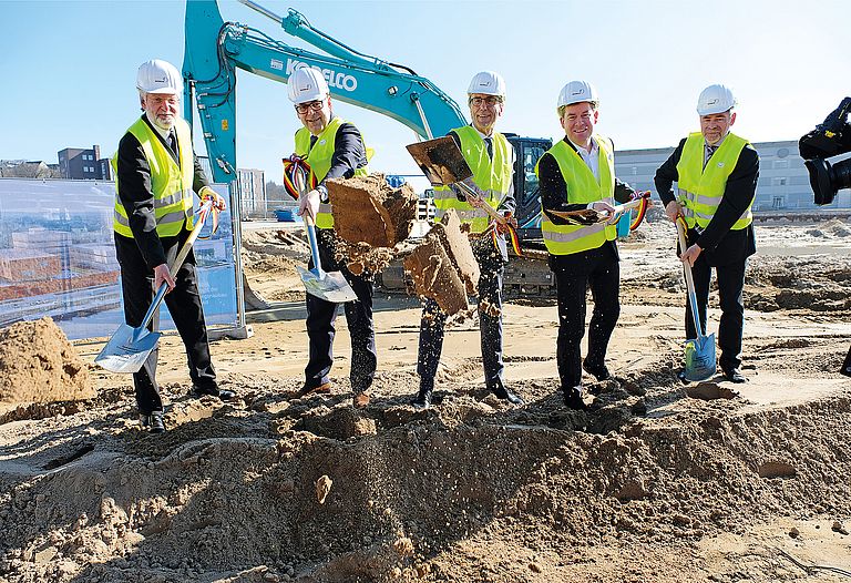 Der erste Spatenstich für den GEOMAR Neubau am 27.03.2017. Von links: der damalige GEOMAR-Direktor Prof. Dr. Peter Herzig, Schleswig-Holsteins Ministerpräsident Torsten Albig, MinDir. Dr. Karl Eugen Huthmacher vom BMBF, Kiels Oberbürgermeister Dr. Ulf Kämpfer und GEOMAR-Verwaltungsdirektor Michael Wagner. Foto: Jan Steffen, GEOMAR