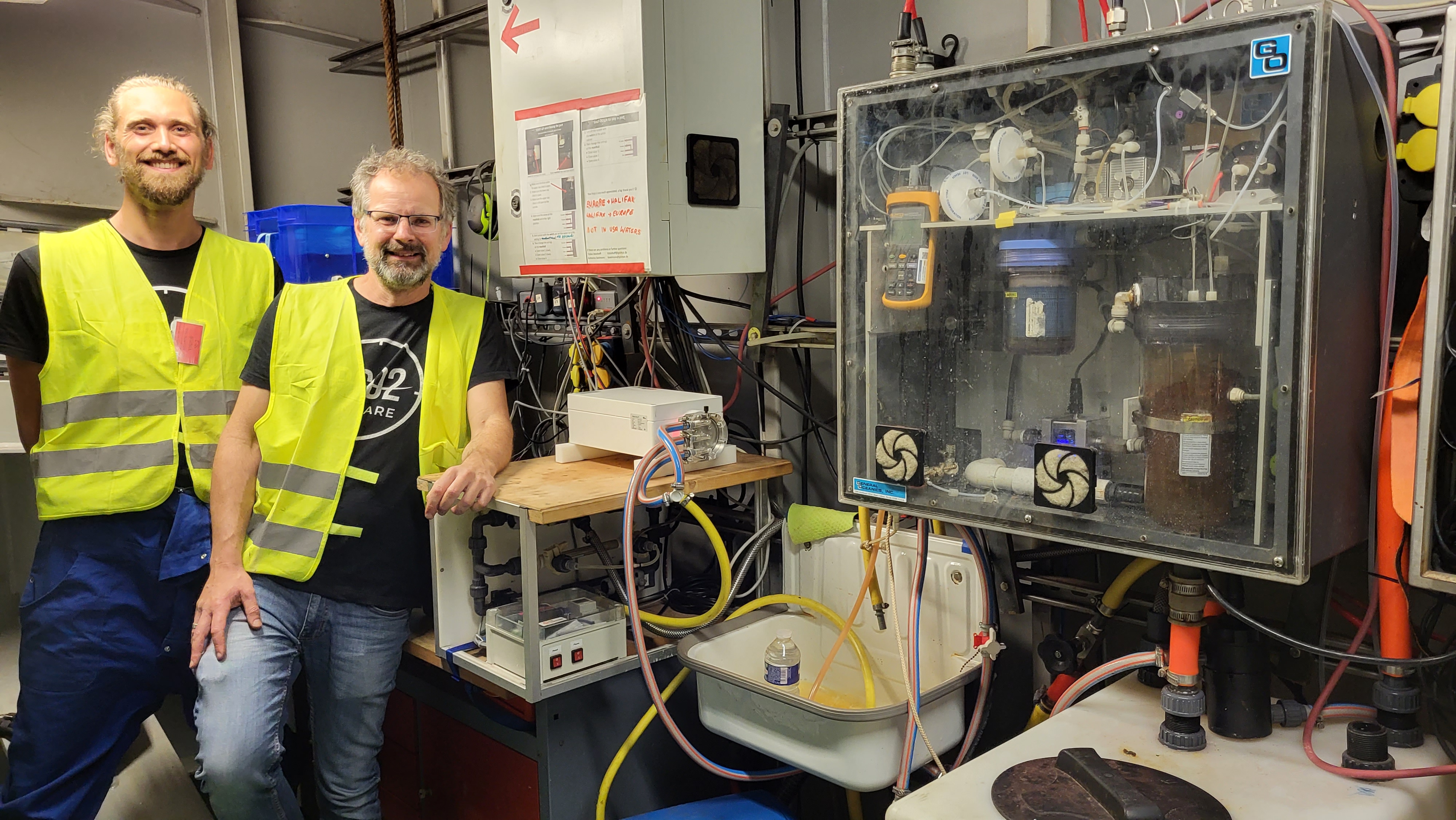 Dr. Tobias Steinhoff (rechts) und Melf Paulsen (links) vor den im Maschinenraum der MS ATLANTIC SAIL installierten Messgeräte. Foto: GEOMAR