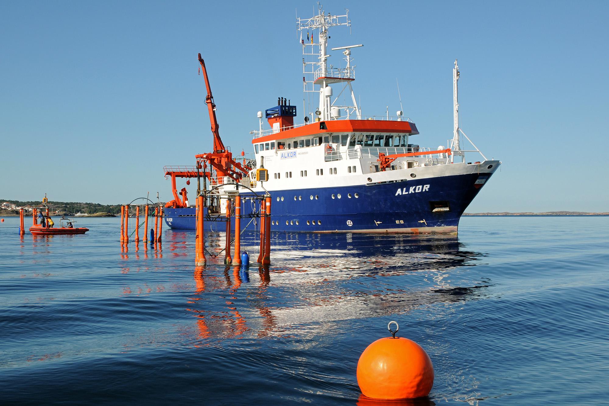 Das Kieler Forschungsschiff ALKOR mit dem KOSMOS-Mesokosmen im schwedischen Gullmarfjord. Foto: Maike Nicolai, GEOMAR (CC BY 4.0)
