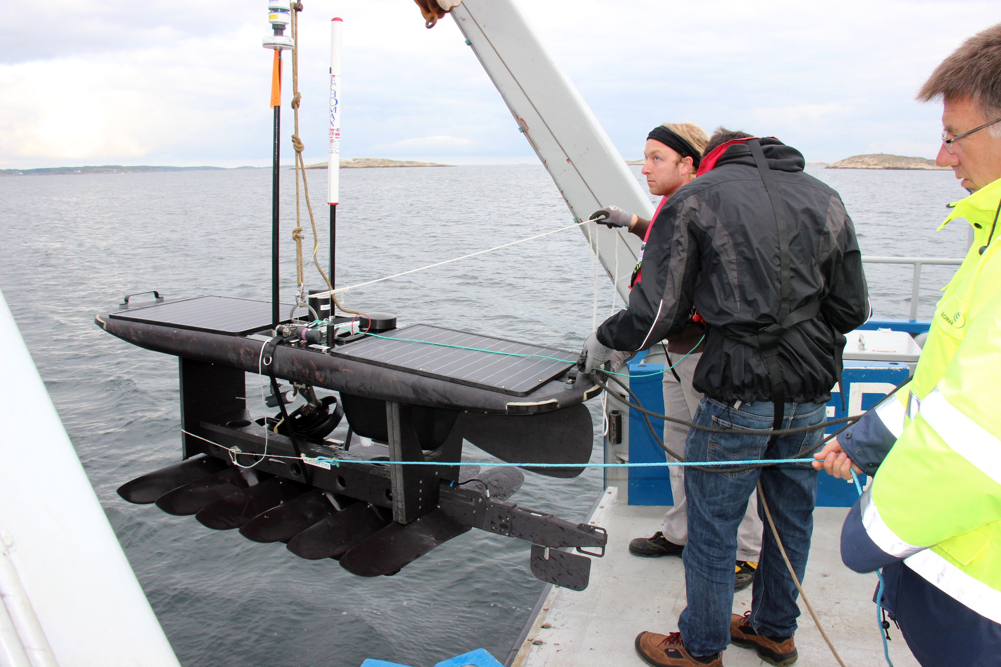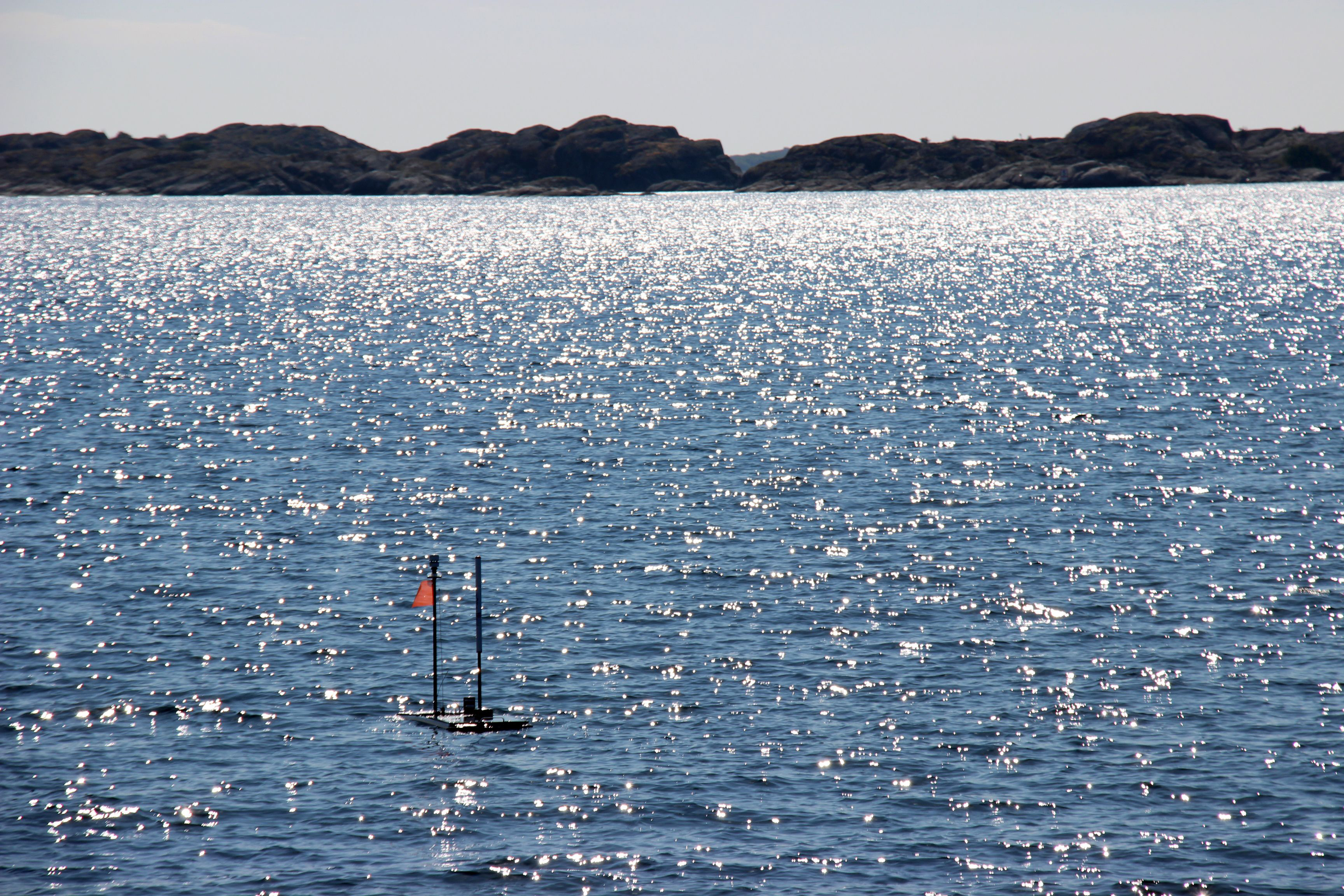 Unbekanntes Seeobjekt in Sicht! Ein Surfbrett? Fast richtig. Per Computer steuerte ein Team um die Meereschemiker Prof. Dr. Arne Körtzinger und Dr. Björn Fiedler vom GEOMAR Helmholtz-Zentrum für Ozeanforschung Kiel in den ersten beiden Septemberwochen zum ersten Mal ihren sogenannten Wave-Glider, zu Deutsch „Wellen-Gleiter“, vor der schwedischen Küste von Tjärnö. In einem ersten Feldtest sollte die neue Technik des Teams ausgiebig geprüft werden, bevor das teure Gerät im offenen Atlantik eingesetzt wird. Es handelt sich dabei tatsächlich um eine Art „High-Tech-Surfbrett“, das mit Solarzellen, Wetterstation, Kompass, chemischen Sensoren und allerlei Technik ausgestattet auf der Meeresoberfläche fährt. Sieben Meter tiefer hängt, durch ein Spezialkabel mit dem Schwimmkörper verbunden, eine Unterwassereinheit mit mehreren beweglichen Flügeln, die Wellenenergie für den nötigen Antrieb nutzt. Durch die Wellenbewegungen klappen die Flügel flossenartig hin und her und ziehen den Gleiter voran. Dank dieses Vortriebs lässt sich das Gerät über Satellit von Land aus präzise navigieren.