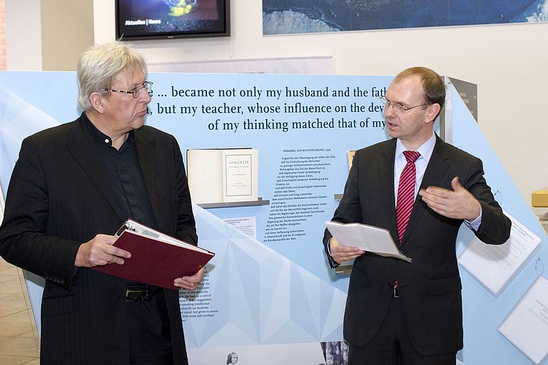 Professor Eberhard Görner sowie Kurator Dr. Holger Pils geben eine Einführung in Elisabeth Mann Borgeses Leben und Wirken. Foto: J. Steffen, GEOMAR