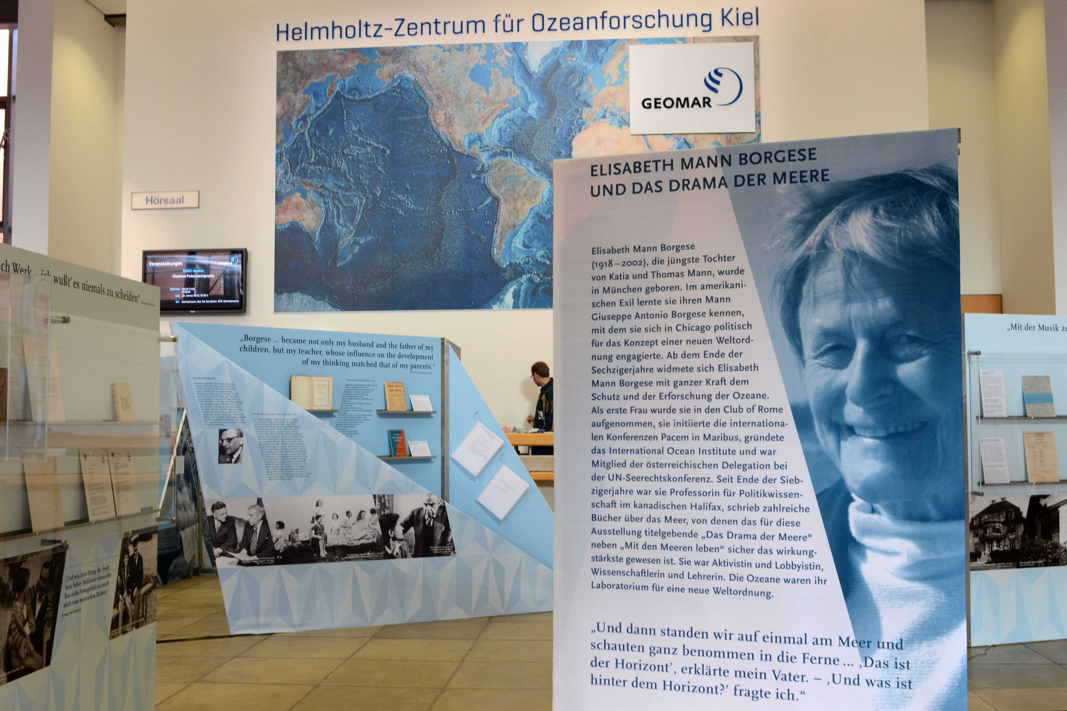 Aus dem Schatten berühmter Eltern herauszutreten ist nicht immer einfach. Zu denen, die es zweifelsohne geschafft haben, gehört Elisabeth Mann Borgese. Die jüngste Tochter von Katia und Thomas Mann hat sich selbst als engagierte Schriftstellerin, Seerechtlerin und Umweltschützerin international einen Namen gemacht. Sie gehörte zu den Gründungsmitgliedern des „Club of Rome“ und hat maßgeblich zum internationalen Seerechtsübereinkommen UNCLOS von 1982 beigetragen. Die Ausstellung „Elisabeth Mann Borgese und das Drama der Meere“ widmet sich ihrer Lebensgeschichte und ihrem vielschichtigen Wirken. 2012, zehn Jahr nach dem Tod Elisabeth Mann Borgeses, wurde sie erstmals im Lübecker Buddenbrookhaus gezeigt. Heute eröffneten Professor Peter Herzig, Direktor des GEOMAR Helmholtz-Zentrum für Ozeanforschung Kiel, und Dr. Holger Pils, Leiter des Lübecker Buddenbrookhauses, die Ausstellung im Foyer des Kieler GEOMAR.
