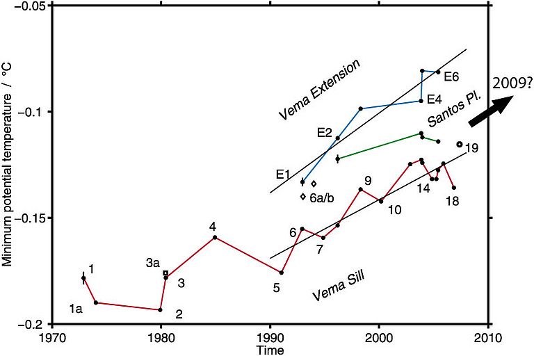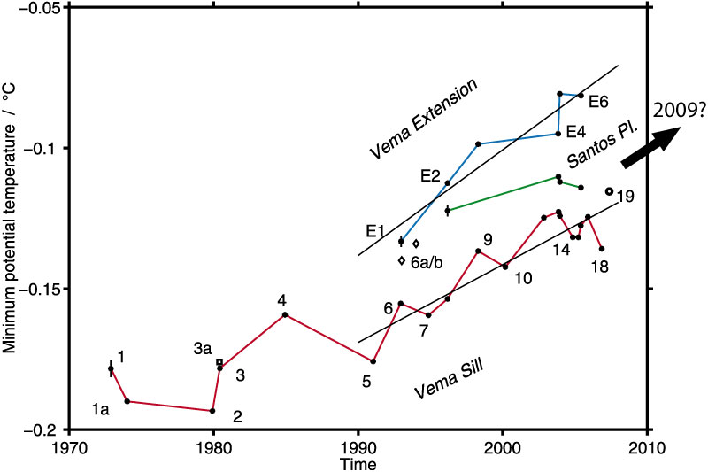 Hier wollen die Wissenschaftler eine 35 Jahre lange Messreihe fortsetzen, um festzustellen, ob die Temperatur des Tiefenwassers weiter ansteigt. In den letzten Jahrzehnten war das der Fall, zwar nur 0,04 Grad, aber genau wie bei den Strömungen, machen auch hier Kleinigkeiten den Unterschied. „Hier handelt es sich nicht um Messfehler, denn unsere Instrumente können sogar Temperaturunterschiede von drei tausendstel Grad messen“, erläutert Dr. Zenk. Und schon so kleine Unterschiede haben einen signifikanten Einfluss auf die Stärke der Strömung und damit auf den großräumigen Wassermassenaustausch. Ob der Temperaturtrend natürliche Ursachen hat oder sich auch dort schon die globale Erwärmung bemerkbar macht, ist allerdings noch nicht klar. Dazu ist noch weiteres „Fiebermessen“ notwendig.