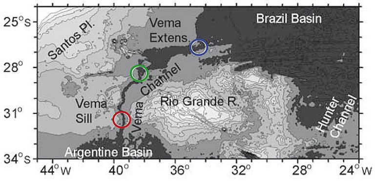 Dr. Walter Zenk, physikalischer Ozeanograph vom Leibniz-Institut für Meereswissenschaften (IFM-GEOMAR) aus Kiel hat schon viele Expeditionen geleitet. Fahrtleiter auf dem größten deutschen Forschungsschiff, der Polarstern des Alfred-Wegener Instituts für Polar- und Meeresforschung, zu sein, ist aber so etwas wie Arbeiten in der Königsklasse. Oft hat es ihn auf seinen Reisen in den Südaltantik gezogen. Dort, wo der Laie an der Oberfläche nur Wasser bis zum Horizont erkennt, liegen die eigentlich spannenden Dinge im Dunkel der Tiefsee. Östlich von Rio de Janeiro, im so genannten „Vema-Kanal“, einem Canyon zwischen dem Argentinischen und Brasilianischen Becken, werden drei Millionen Kubikmeter Wasser pro Sekunde am Boden nach Norden transportiert. Durch den 15 Kilometer breiten Kanal in 4500 Metern Wassertiefe fließt dabei 20 Mal mehr Wasser als über den Amazonas in den Atlantik gelangt. Das Wasser, auch antarktisches Bodenwasser genannt, stammt aus südpolaren Breiten, wo es im Weddell-Meer während des Winters gebildet wird. Dabei wirken schon geringe Dichteunterschiede als Antrieb. Im engen Kanal schwillt die Strömung auf etwa 25 Zentimeter pro Sekunde an. „Das scheint auf den ersten Blick nicht viel, ist aber in diesen Wassertiefen schon fast wie ein Sturm in der Atmosphäre“, erklärt Dr. Zenk.